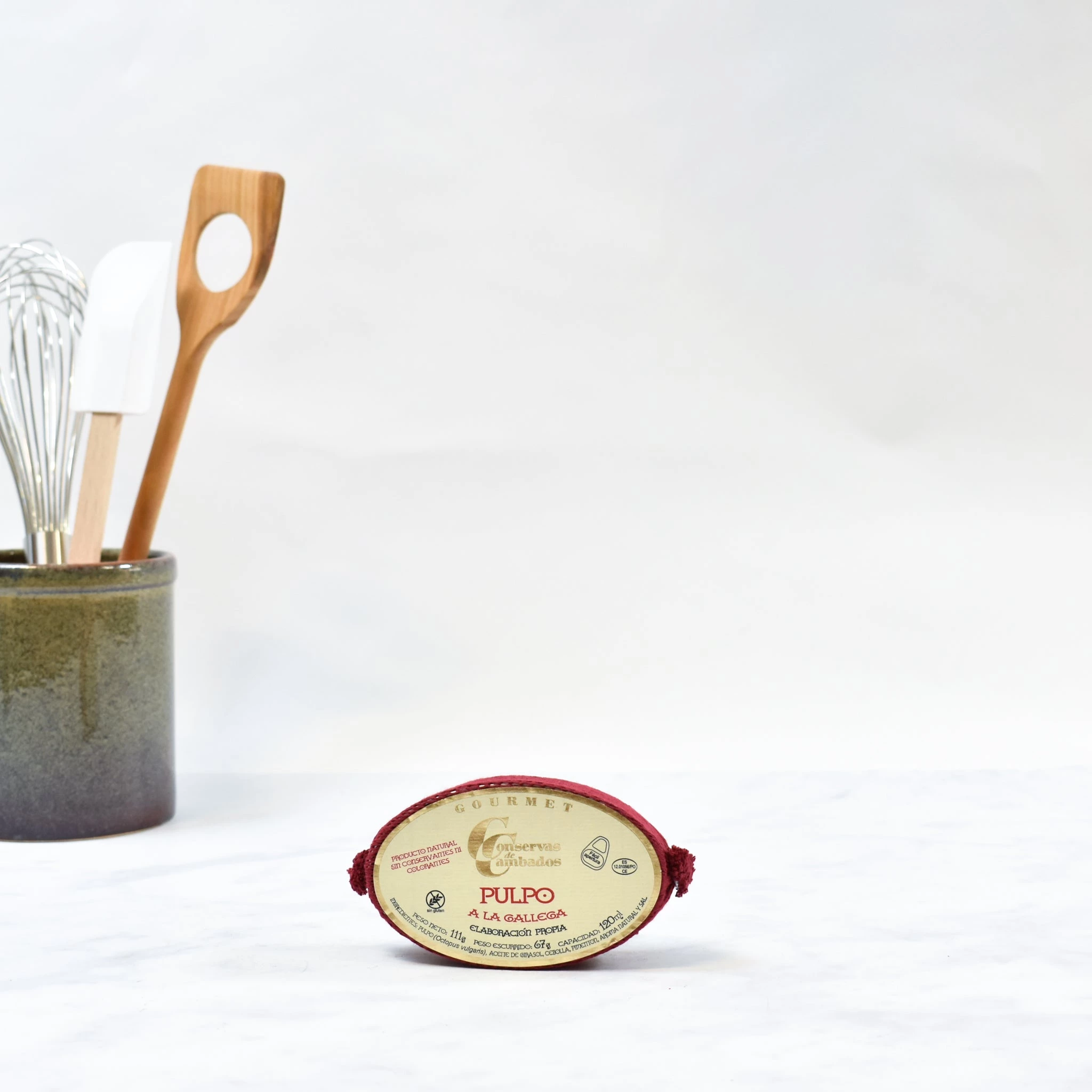 Ingredienti: polpo, olio di girasole, cipolla, paprika, sapore naturale, sale. Contiene allergeni: molluschi