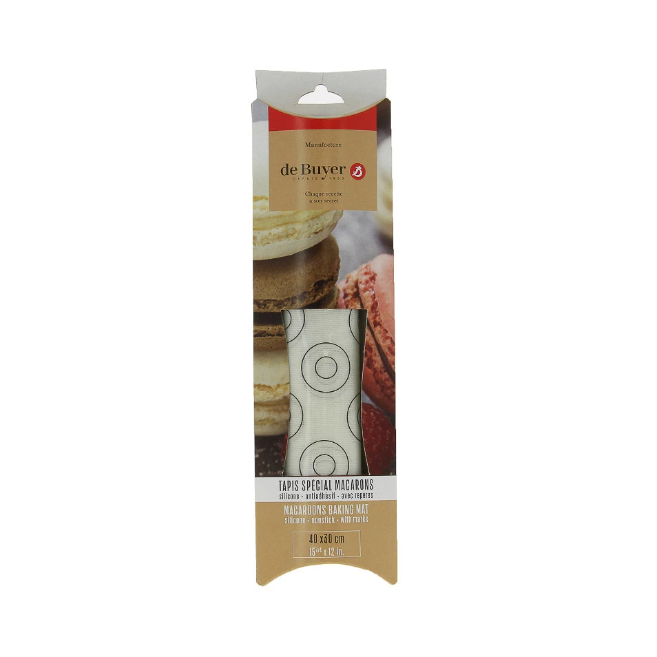 La stuoia da forno De Buyer antiaderente a macaron stencil è qualcosa di cui ogni macaron-maker ha bisogno. La stuoia da pasticceria è contrassegnata con i cerchi, in modo da poter infilare la giusta quantità di miscela per le conchiglie macaron uniformi ogni volta.