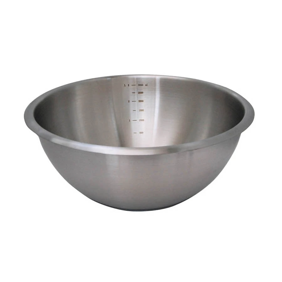 La ciotola De Buyer è di 30 cm di diametro e ha una superficie di 30 cm.Capacità di 7 litri. Una scala è inciso al laser all’interno, in modo da poter vedere a colpo d’occhio il volume di ingredienti o miscela nella ciotola.