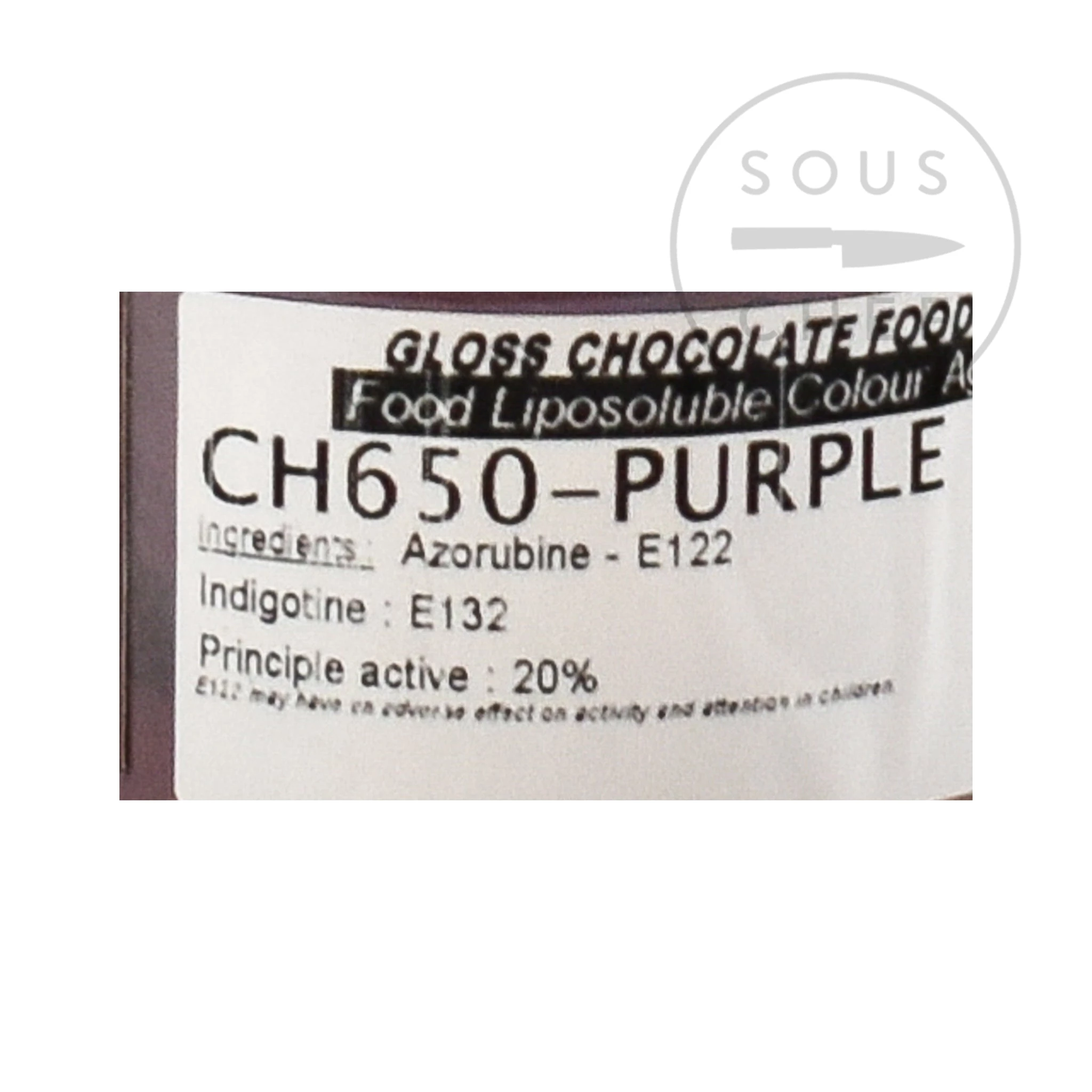 Per l’uso, mescolare il colore del cioccolato viola con cioccolato bianco fuso o burro di cacao fuso a 35°C. Mescolare bene e applicareil cioccolato colorato utilizzando una spazzola o una pistola spray al cioccolato. Se si utilizza uno spray, passare attraverso un setaccio prima dell’uso. Utilizzare circa 1 cucchiaio per 200 g di cioccolato o burro di cacao.