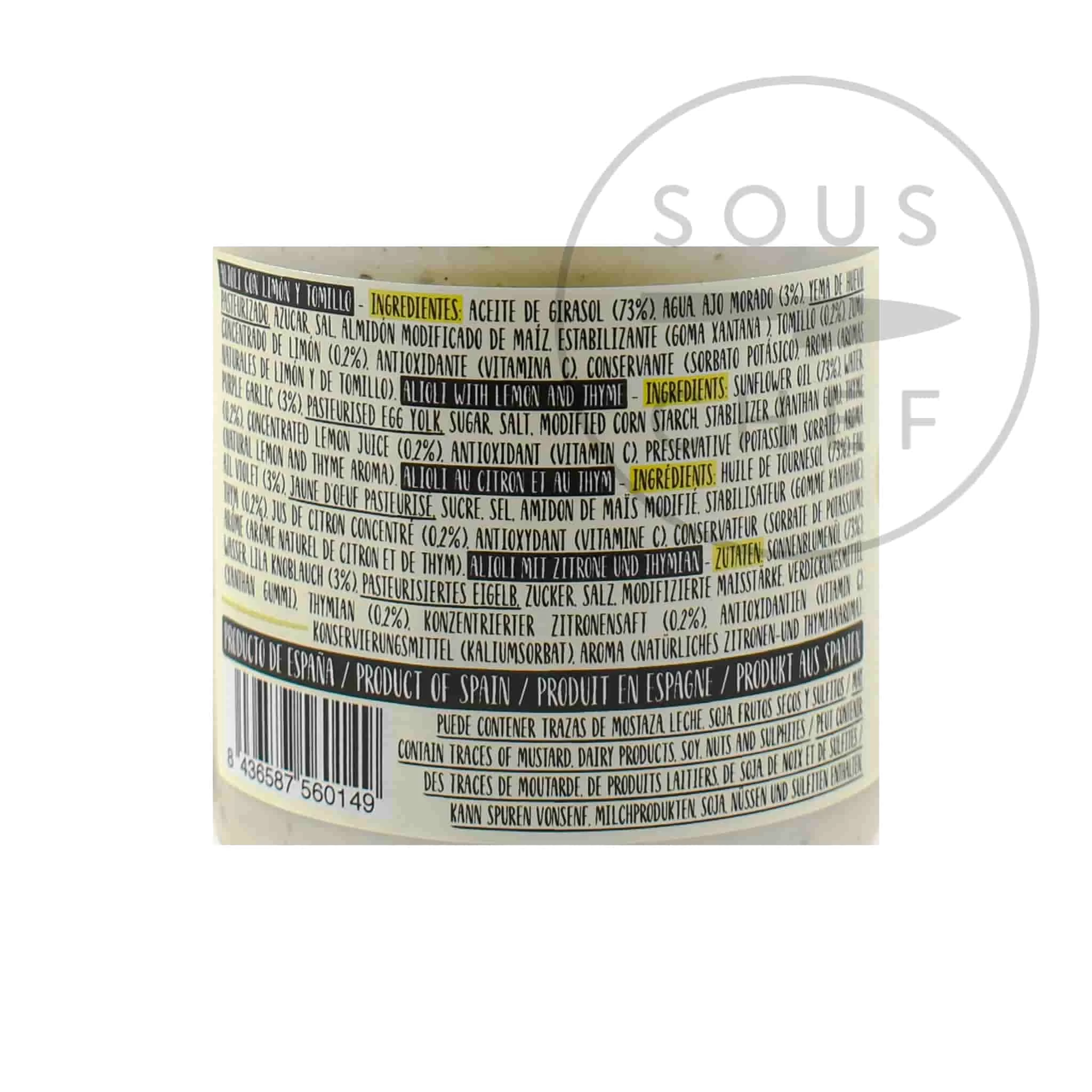 Ingredienti: olio di girasole (73%), acqua, aglio viola (3%), Yolk di uovo pastorizzato, zucchero, slat, amido di mais modificato, stabilizzatore (gomma xantana), timo (0,2%), succo concentrato di limone (-2%), antiossidante (vitamina C), conservante (sorbato di potassio), aroma (Aroma naturale di limone e timo).