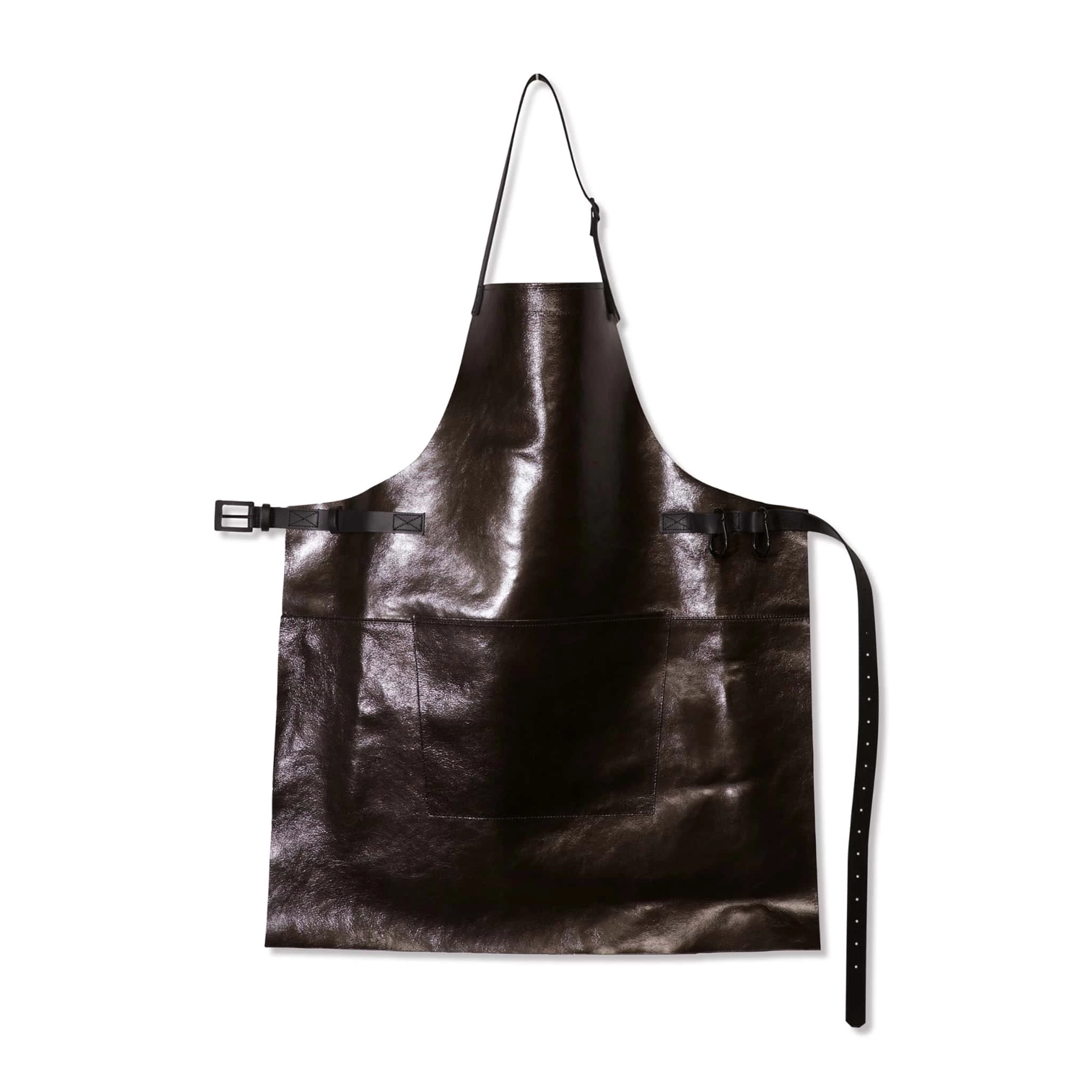 The handmade apron is made from 100% full grain leather and is finished in a transparent, dirt-repellent coating to keep it looking its best. The leather will soften and develop a patina over time – so the more you wear it, the better it will get! The apron has a fully adjustable neck strap, a large front pocket and towel loops at the waist. The apron also comes with carabiners, so you can keep things like tongs and spatulas close and keep your hands free.