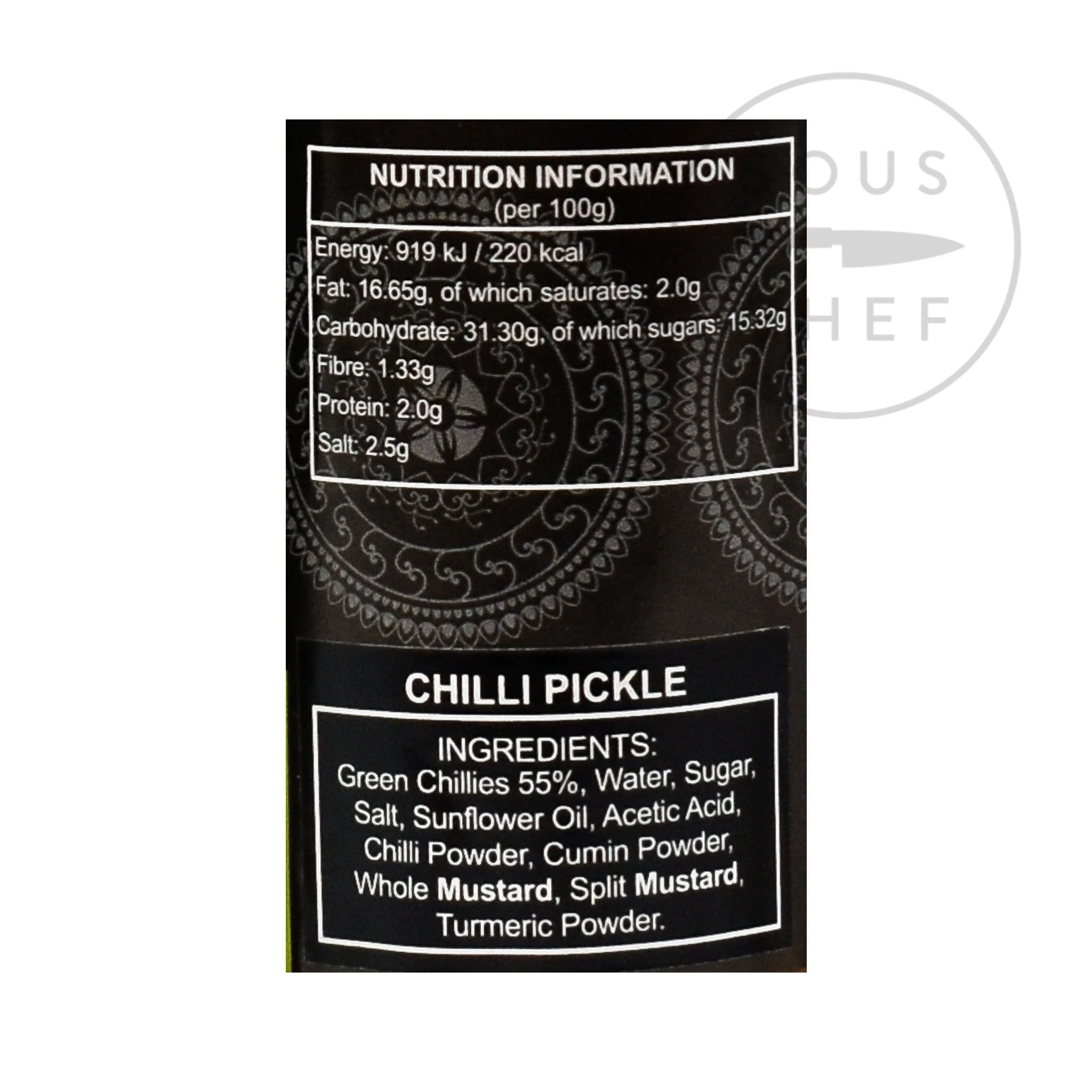 Ingredienti: peperoncini verdi 61%, zucchero, olio di girasole, acqua, sale, acido acetico, peperoncino in polvere, polvere di cumino, wsenape di ole, senape spaccata, polvere di curcuma. Contiene senape