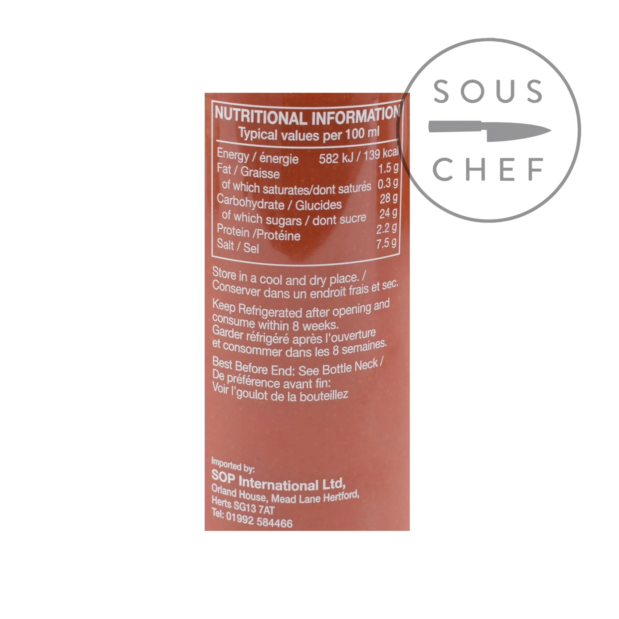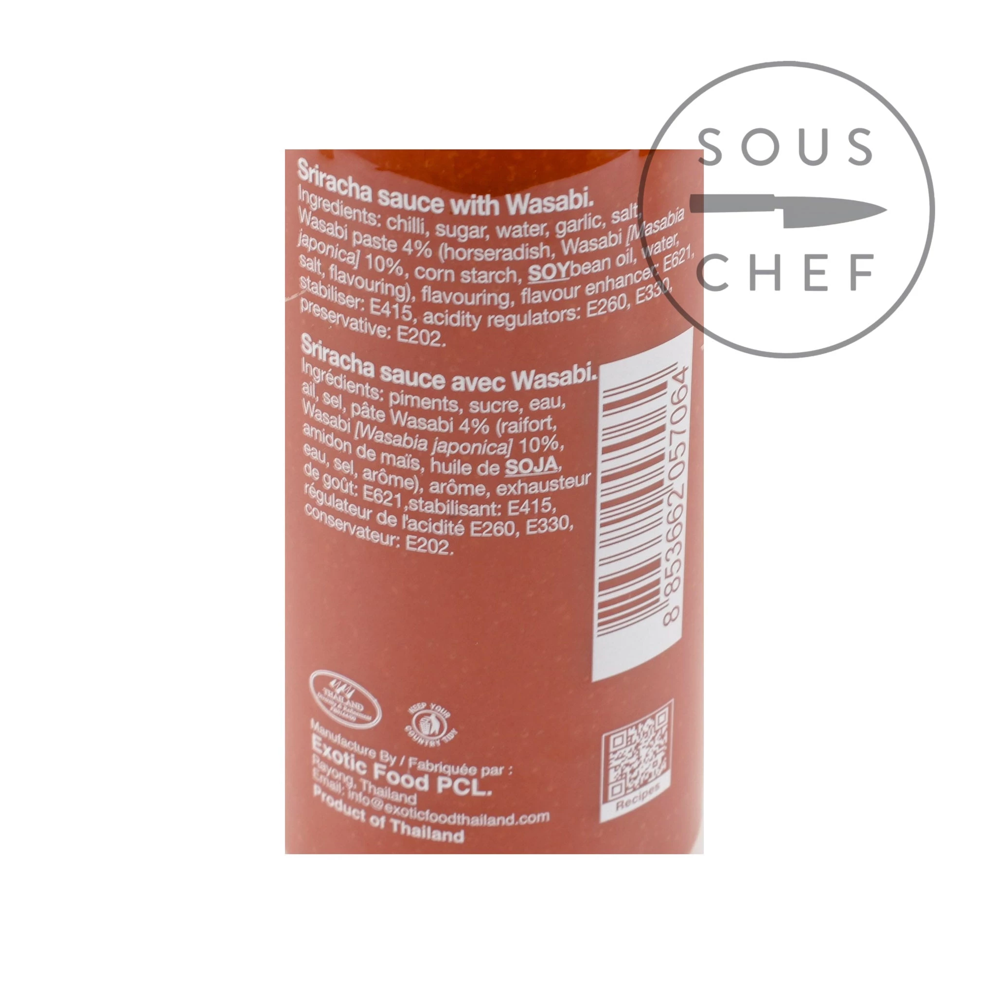 Ingredienti: Chilli, zucchero, acqua, aglio, sale, condimento pasta Wasabi 4% (orseradish, Wasabi [Wasabi japonica] 10%, amido di mais, soybean olio, acqua, sale, aroma), aroma, esaltatore di sapori:L 261 stabilizzatore: E415, acidiE260, E330, conservante: E202.