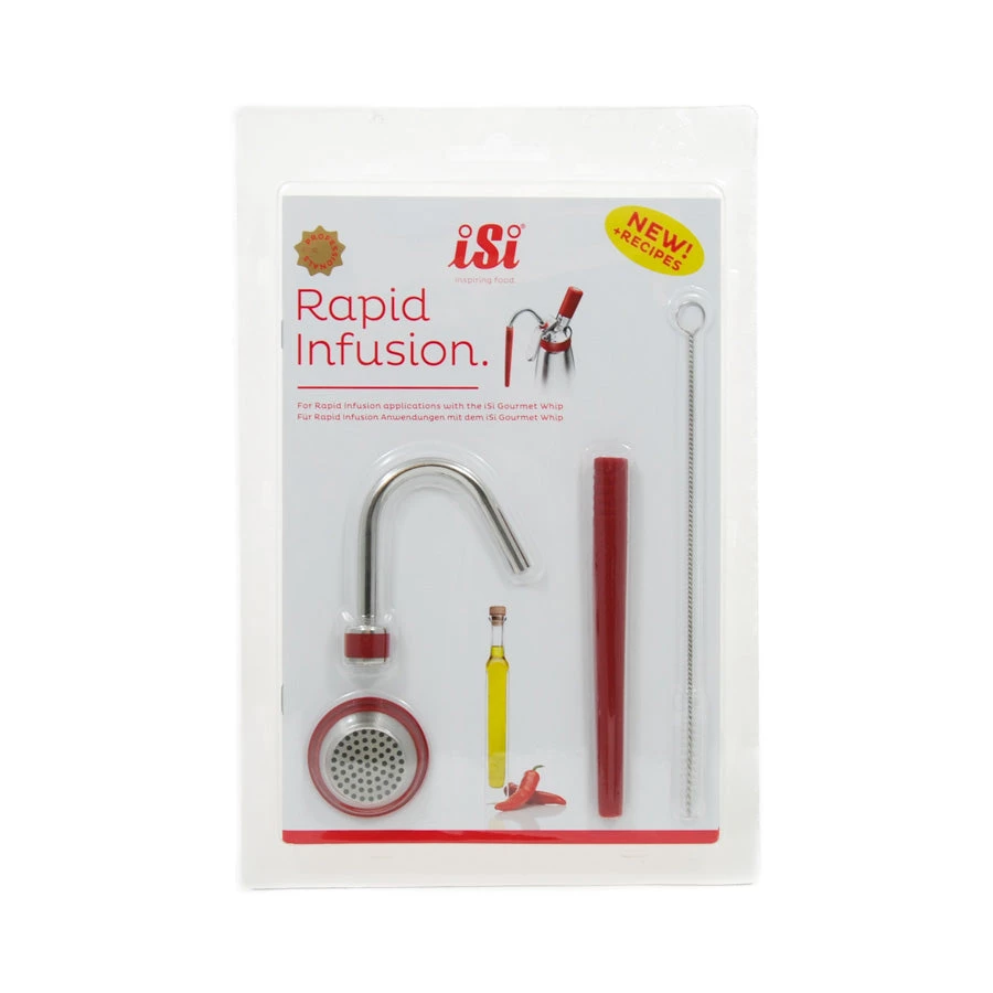 Il set per infusione rapida iSi consente di infondere rapidamente un liquido con diversi sapori. Inoltre, utilizzando gli accessori per infusione rapida con la frusta gourmet iSi, è possibile ridurre facilmente la pressione e raccogliere la schiuma di fuga o il liquido in un contattoner.