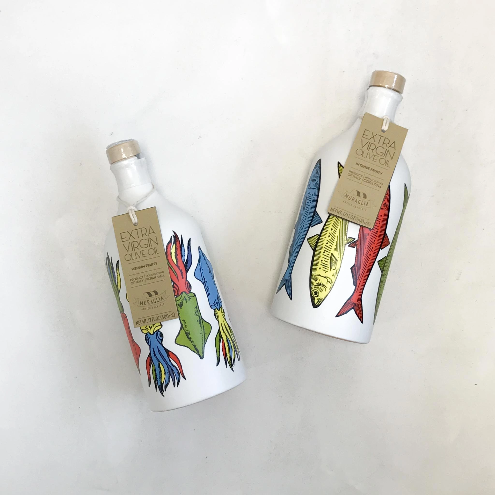 Illumina la tua cucina con questo olio extravergine di oliva fruttato medio in una bottiglia di terracotta di seppia. Le seppie vibranti portano una strana sensazione mediterranea alla bottiglia, e l’olio d’oliva è uno dei migliori del sud Italia.
