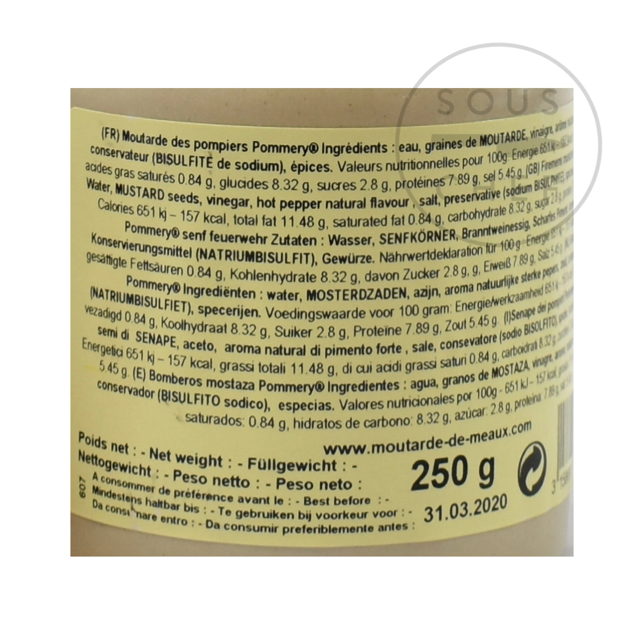 Passare la senape sulla carne di maiale o di manzo prima della grigliatag, barbecue o tostatura. La senape darà una crosta appiccicosa con calore di peperoncino. O servire a tavola come condimento con bistecca, salsicce, hamburger o verdure verdi. Si può anche mescolare attraverso crauti per un accompagnamento caldo-e-sour a schnitzel.Il Moutarde de Meaux è considerato uno dei grandi moutardieri mondiali. Le loro premiate mostarde Pommery sono una delle preferite dagli chef professionisti. Tutte le mostarde sono confezionate in vasetti di gres tradizionali.La mostarda è fatta a Meaux, una città cattedrale 60 km ad ovest di Parigi. La città ha una lunga storia di produzione di senape. E ‘iniziato nel 771 dC, quando Carlo Magno ha decretato che canoni une monaci in città cattedrale come Meaux dovrebbe coltivare la senape.