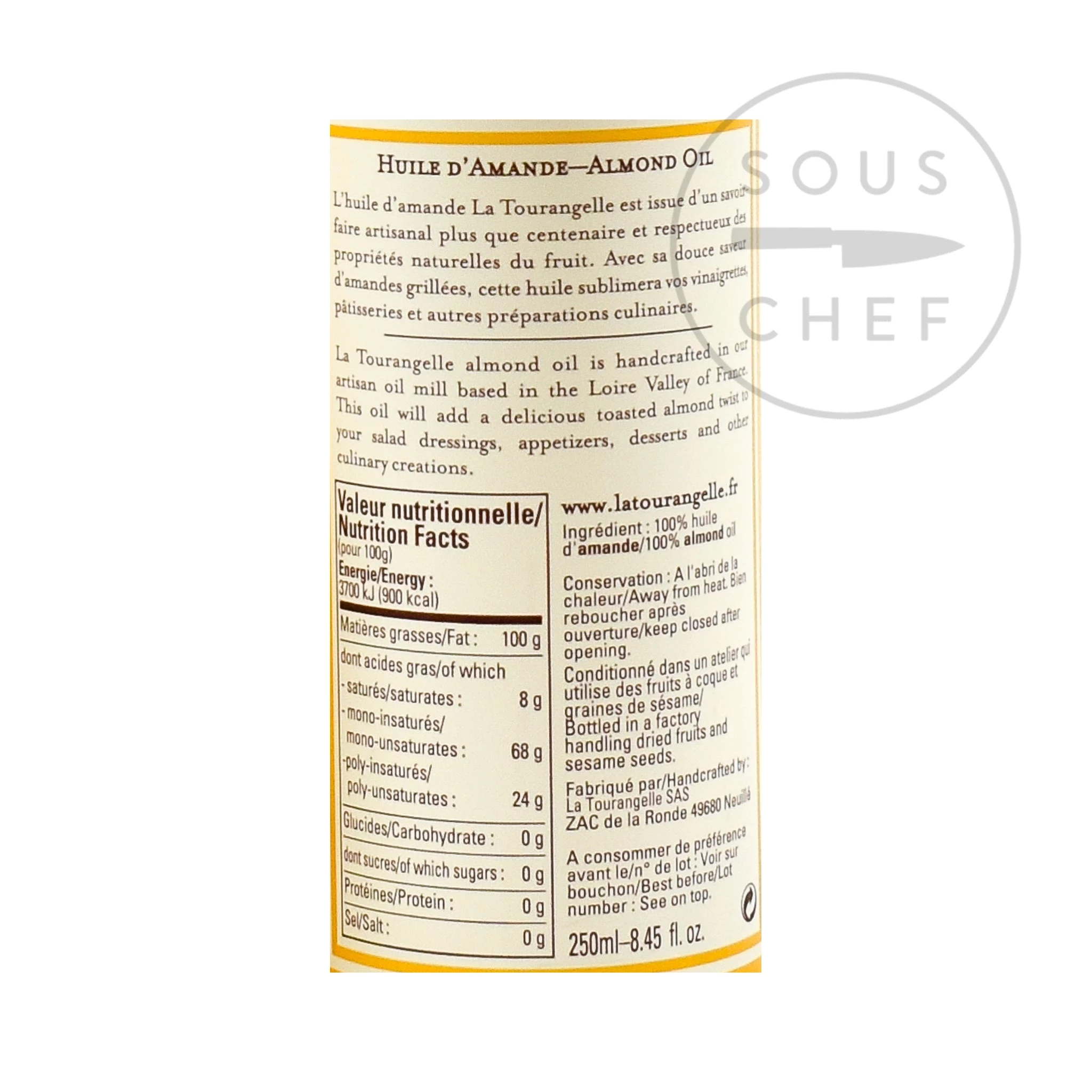 L’olio di mandorla Tourangelle è lavorato a mano nel frantoio artigianale Tourangelle con base nella Valle della Loira in Francia. L’olio di mandorla puro è fatto da mandorle tostate delicatamente, per portare una leggera torsione di mandorla ai condimenti da insalata, antipasti, dolci e altriLa produzione di olii gourmet è una tradizione storica in Francia. In origine, ogni villaggio aveva un mulino che arrostiva ed estraeva l’olio dalle noci raccolte dai contadini locali. Questi deliziosi oli venivano utilizzati nella ricca cucina rustica eLa Tourangelle è uno dei pochi frantoi tradizionali, un produttore a conduzione familiare di oli e aceti di alta qualità.
