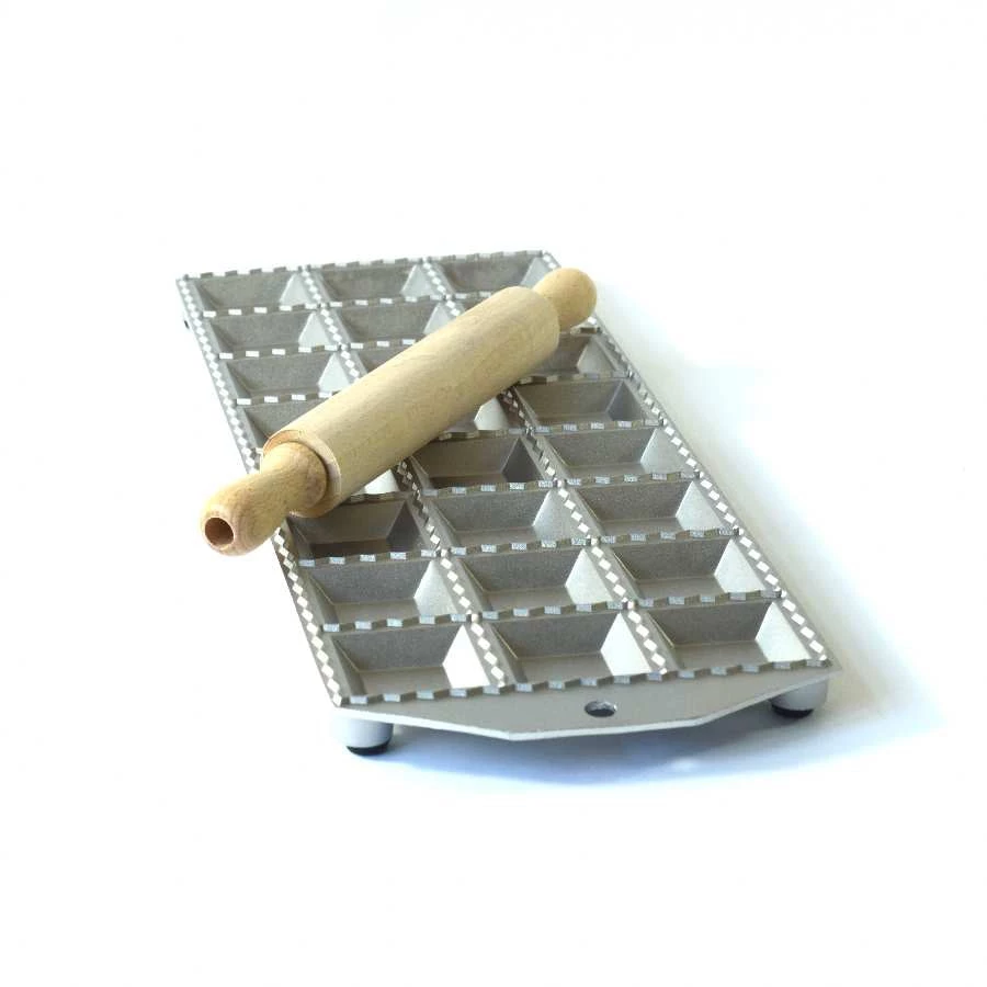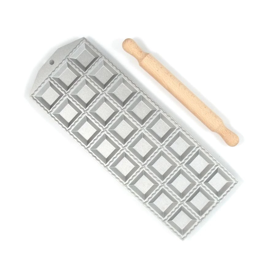 Fate ravioli freschi e fatti in casa con questo grande vassoio di ravioli 24 quadrati e mattarello. Stendete un foglio di pasta e premete delicatamente nelle piazze. Riempite con funghi o caprette di formaggio, aragosta, zucca, o qualsiasi altro ripieno fatto in casa – e poi plUtilizzare il mattarello per premere insieme i pacchi e separare in singoli ravioli.