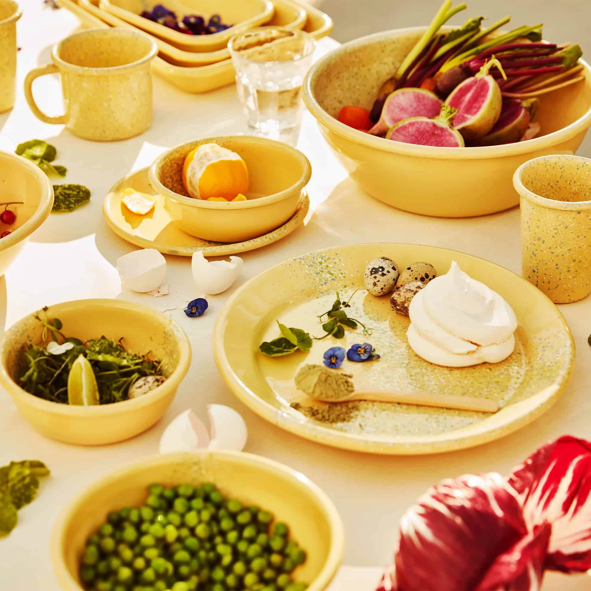 Con lo Splatter Fest smalto laterale in giallo, è possibile servire piatti di tutti i giorni in modo sorprendente.un disegno a splatter nelle tonalità del bianco e del verde. Utilizzare questa piastra laterale per servire fette di torta di frutta, porzioni di tiramisu e cunei di focaccia squishy. Mix e abbinare questo plater con altri pezzi della nostra collezione di smalto per una tabella colorata spread.