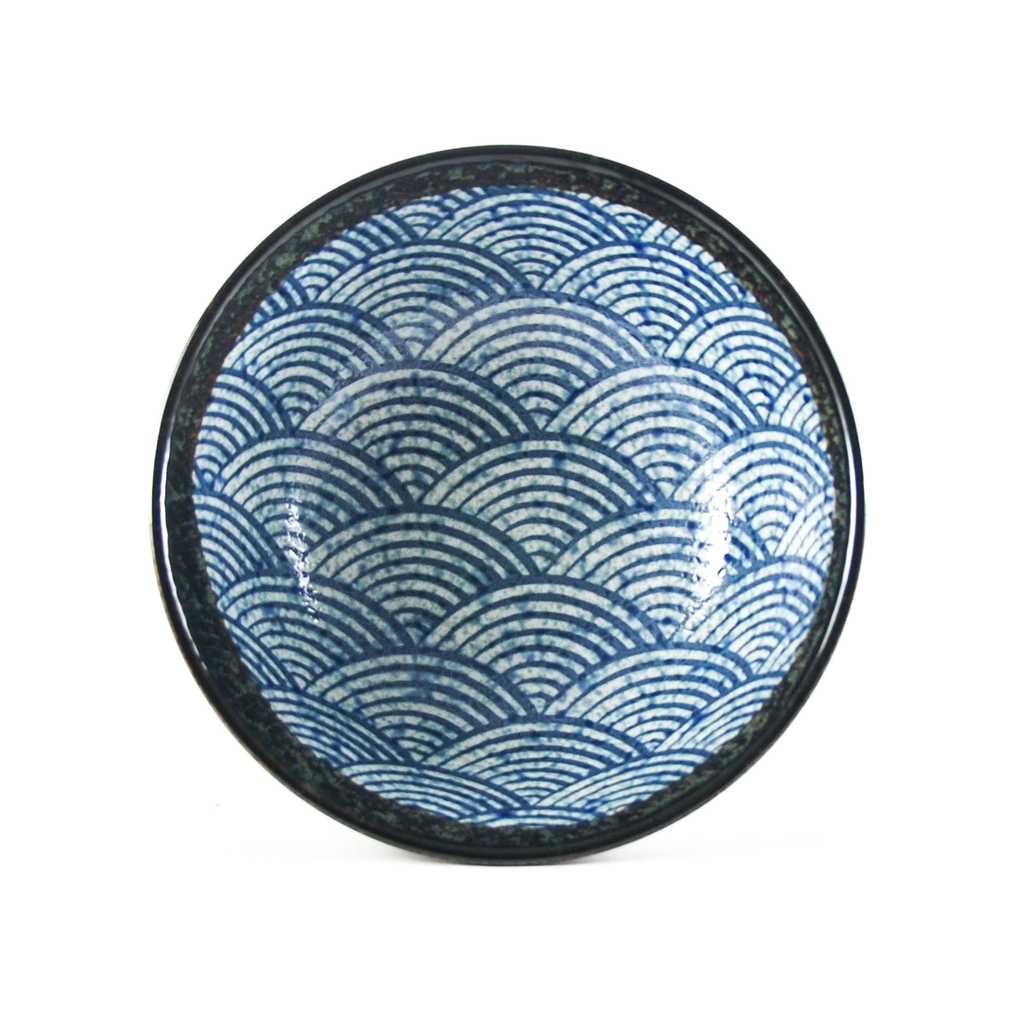 La ciotola di ramen è decorata con uno smalto bianco e blu strutturato in un motivo ad onda stilizzata.finito con un bordo nero-marrone lucido.