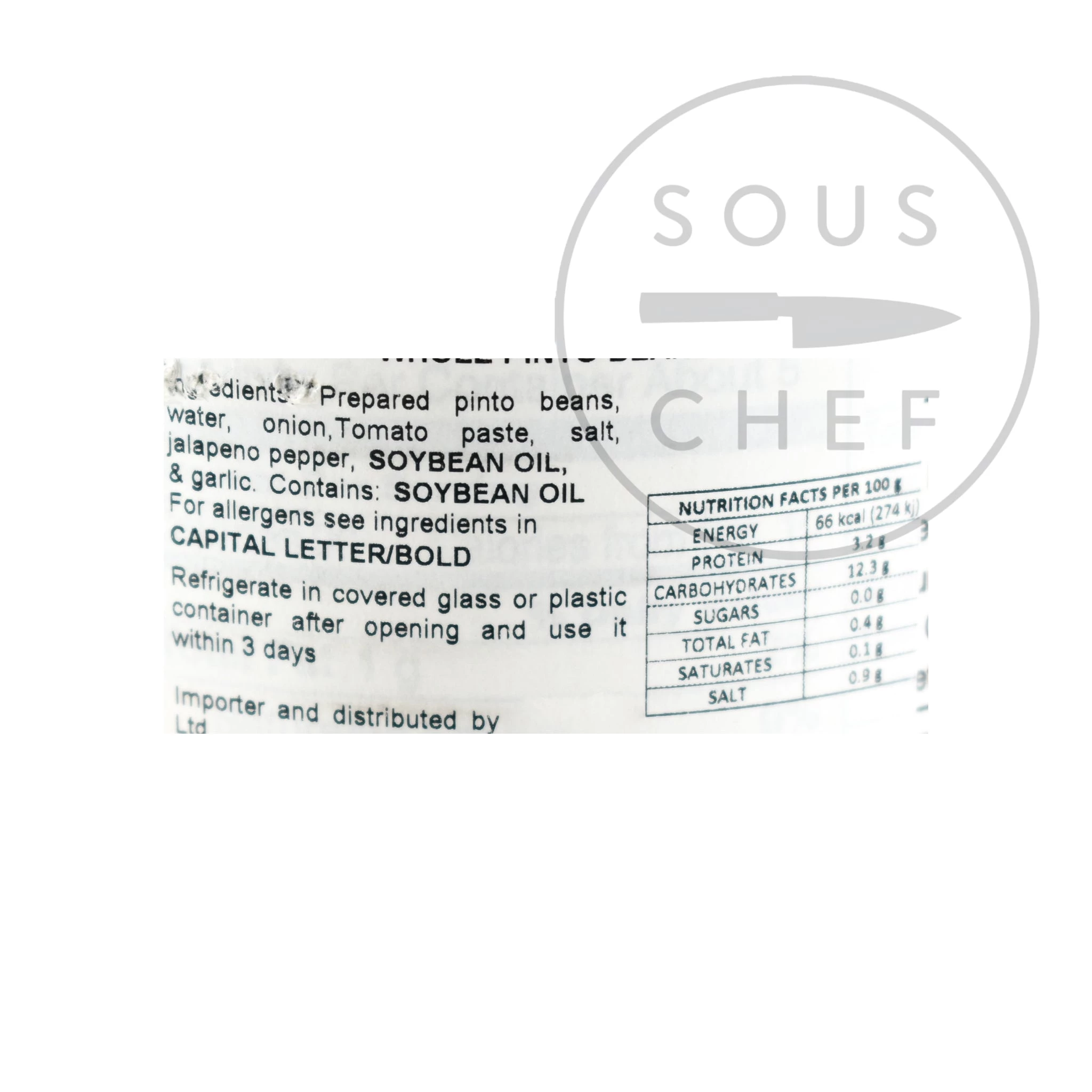 Ingredienti: fagioli pinto preparati, acqua, cipolla, pasta di pomodoro, sale, pepe jalapeno, soybean oil, aio.