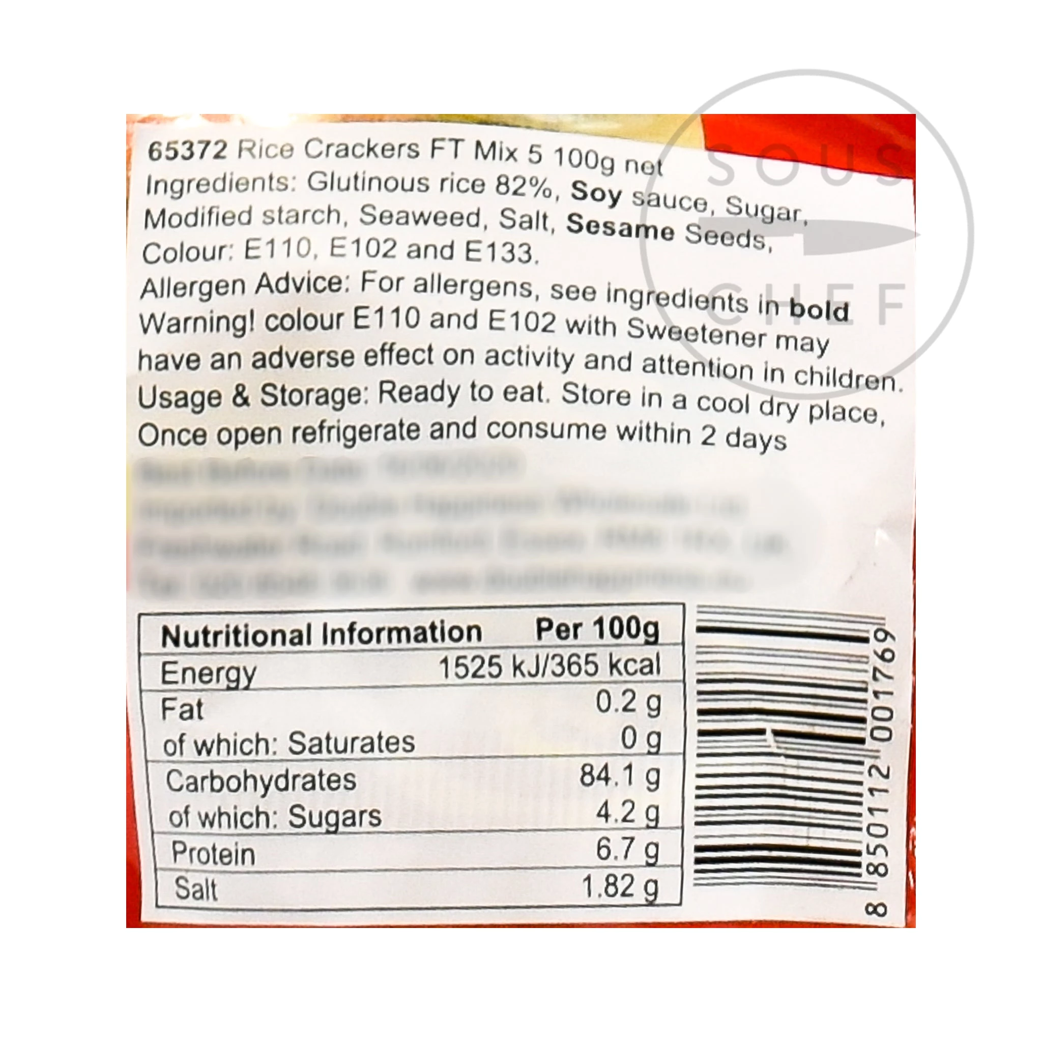 Ingredienti: riso glutinoso (82%), salsa di soia, zucchero, amido modificato, alghe marine, sale, sesamoe semi, colori: E110, E102, E133. Contiene allergeni: soia, sesamo.