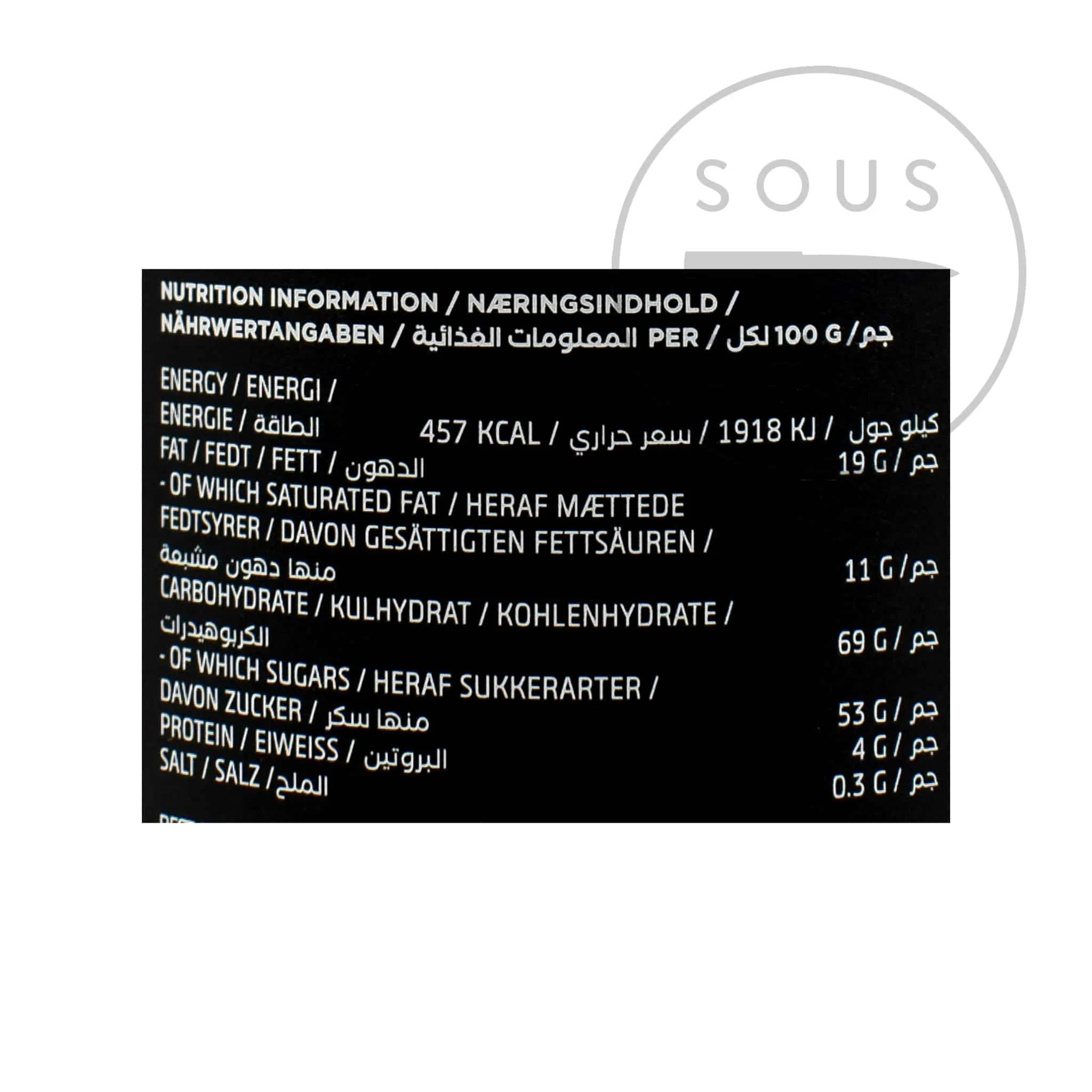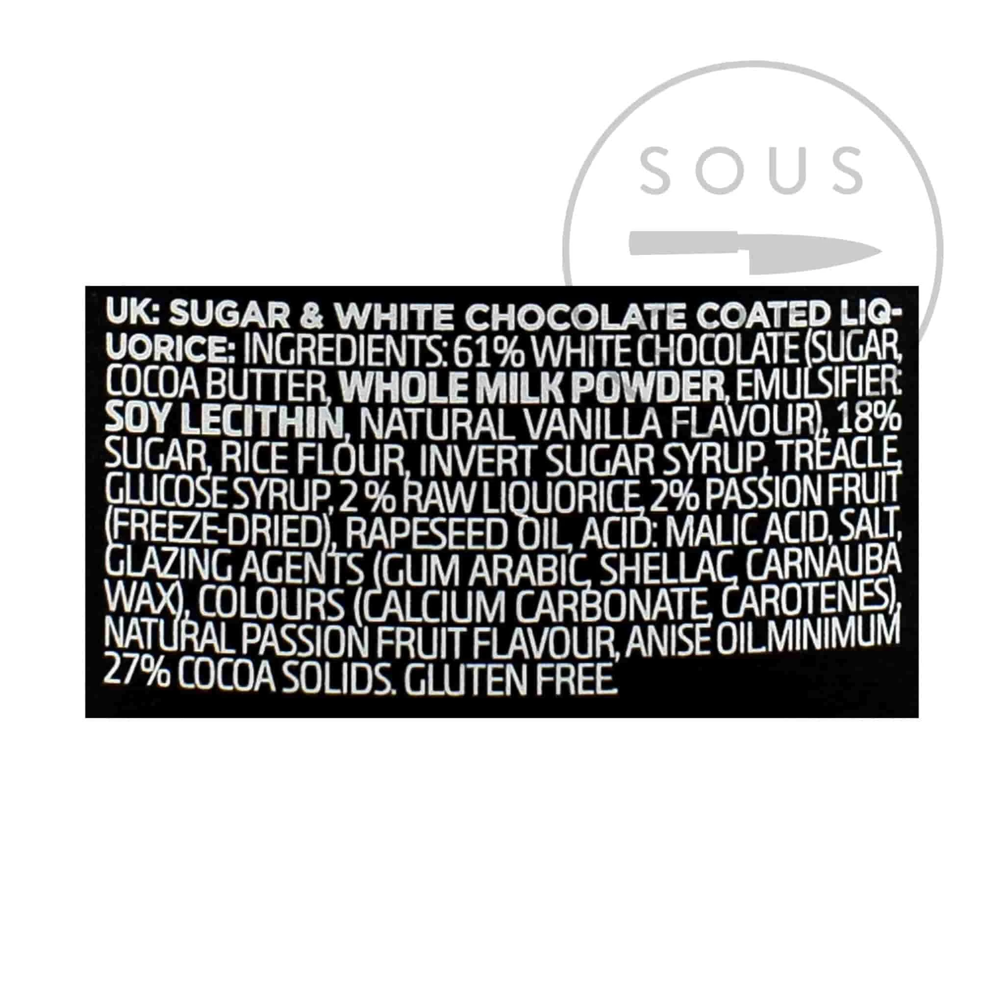 Ingredienti: 61% cioccolato bianco (zucchero, burro di cacao, intero latte polvere, emulsionante: soy lecitina, aroma naturale di vaniglia), 18% zucchero, farina di riso, sciroppo di zucchero invertito, treacle, sciroppo di glucosio, 2% liquirizia cruda, 2% frutto della passione (essiccato congelato), olio di colza, acido: acido malico, sale, agente vetrario (gum arabic, gommalacca, carnauba)cera), coloranti (carbonato di calcio, caroteni), aroma naturale di frutto della passione, olio di anice. Minimo 27% di solidi di cacao. Senza glutine.