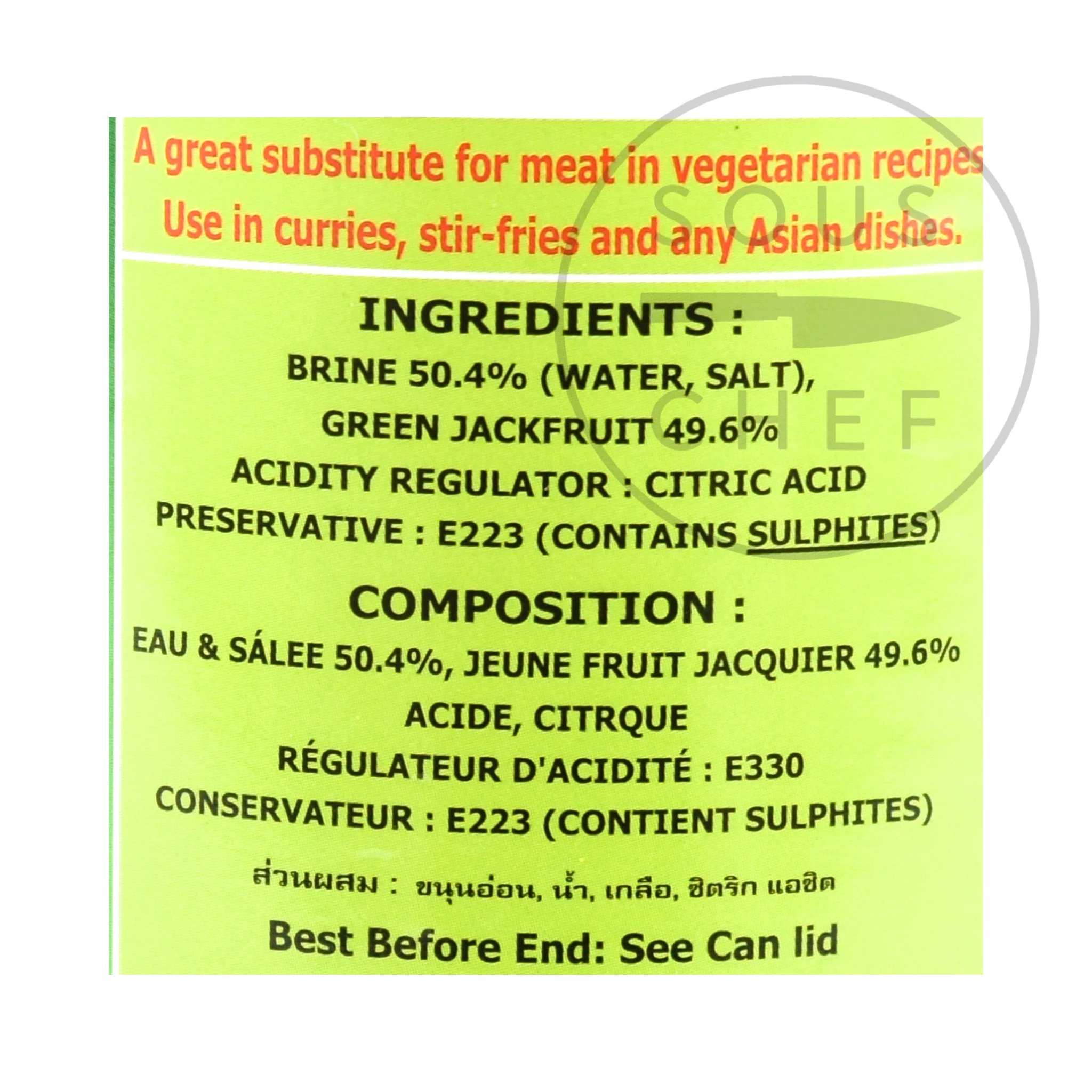 Ingredienti: Brine 50.4% (Acqua, Sale), Green Jackfruit 49,6%, Regolatore di acidità: Acido citrico, Conservante: E223 (contiene sulfites)