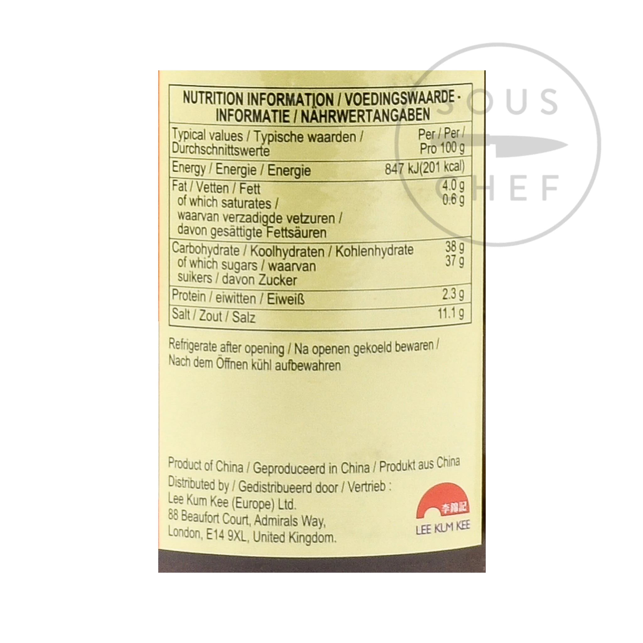 Ingredienti: Zucchero, Acqua, Pasta di pomodoro, Sale, Fermentato Soybean Paste (Wa)ter, Salt, Soybeans, WheatFlower), SesameIncolla, amido modificato di mais, spezie, SesameOlio, Colore (E150a), Aglio disidratato, Acido (E260), Stabilizzatore (E415) (Soybeans, Wheat). Gli allergeni sono elencati in bold.