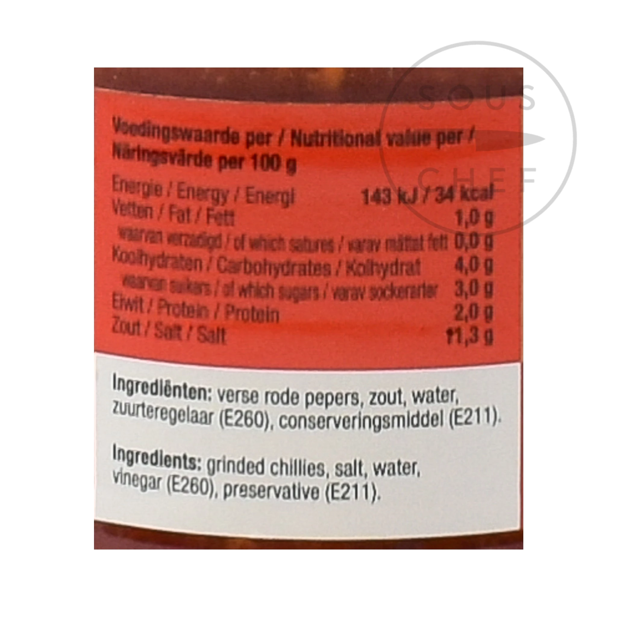 Ingredienti: peperoncini macinati, sale, acqua, aceto, E260, conservanti E211