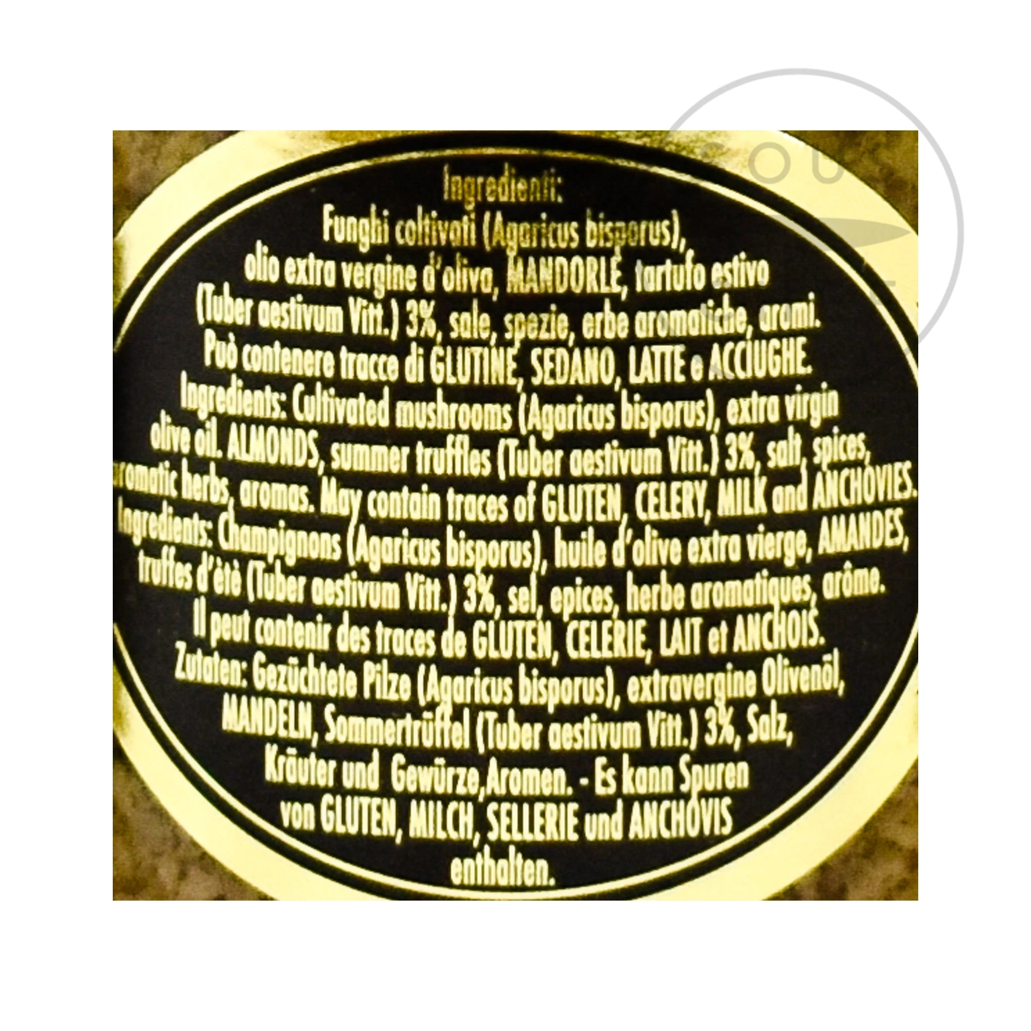 Ingredienti: funghi coltivati (agaricus bisporus), olio di girasole, tartufi estivi (tuber aestivum vitt) 5%, sale, spezie, erbe aromatiche, almonds, succo di limone, aroma. Contiene noci. Può contenere tracce di glutine, latte e acciughe.