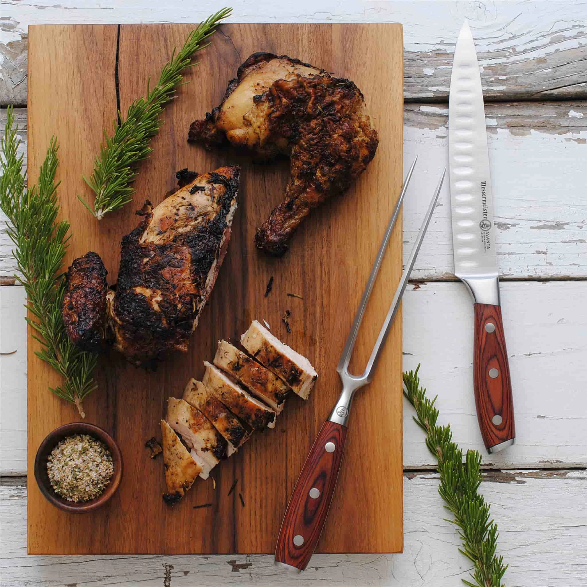 Use Messermeister [50] Avanta Pakkawood sculture set per scolpire le articolazioni arrostite e le carni barbecue in modo pulito e senza intoppi.Coltello e forchetta a doppio taglio della gamma Messermeister Avanta, in acciaio inossidabile tedesco X50 di alta qualità.
