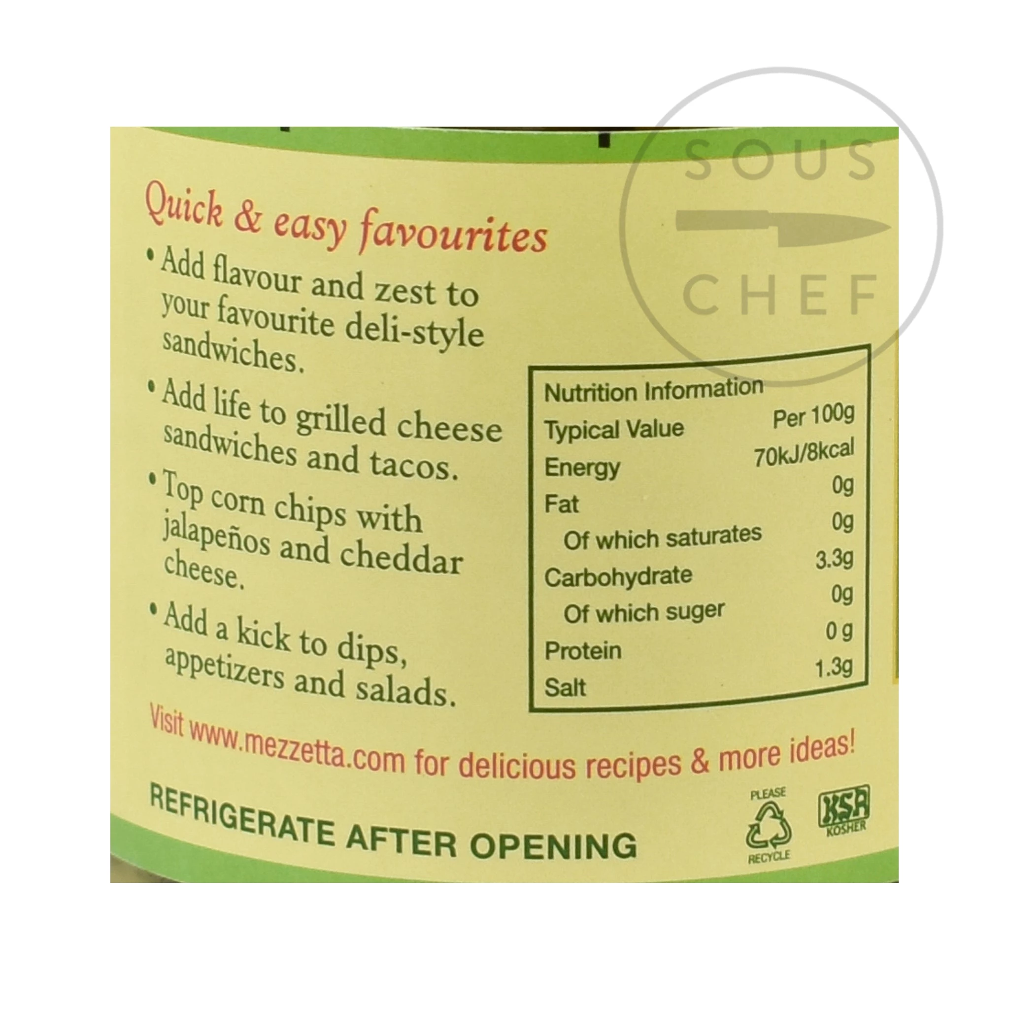 Ingredients: peperoni jalapeño (46%), acqua, aceto distillato, sale marino, rassodante: cloruro di calcio, aroma naturale, curcuma.