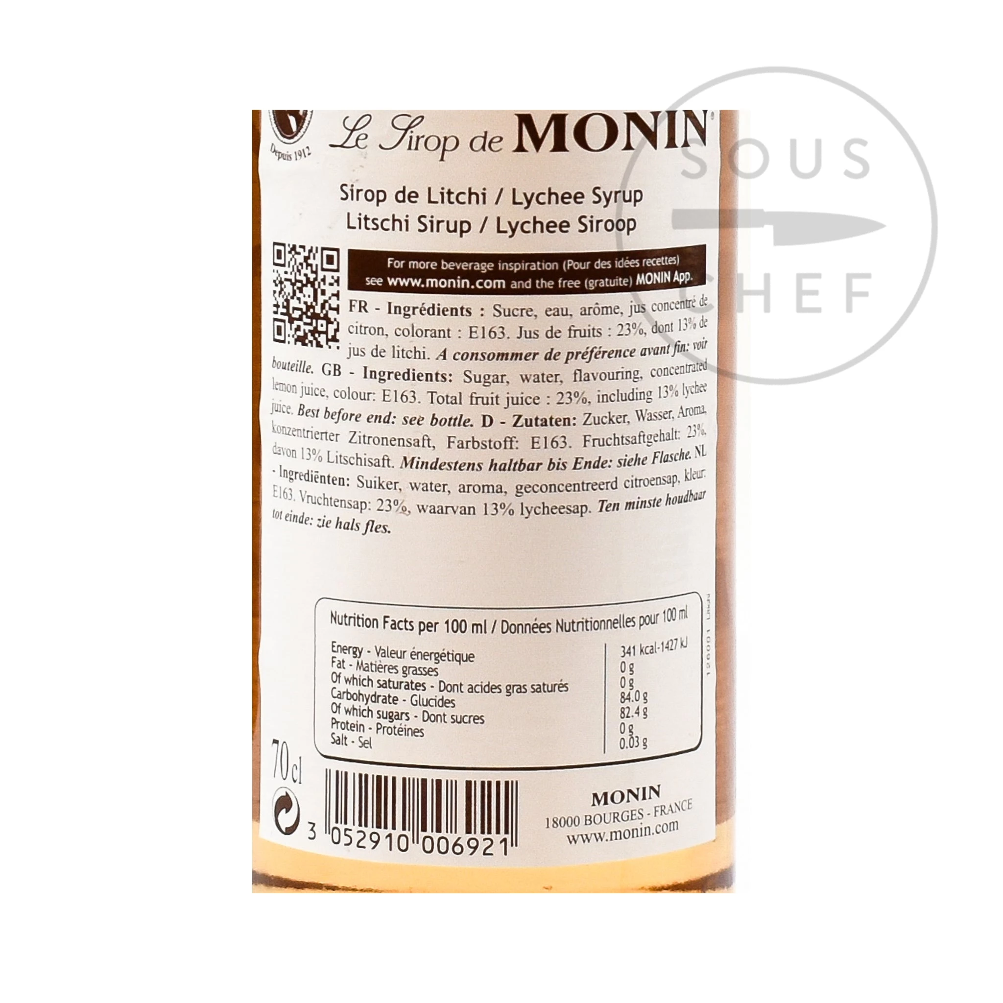 Ingredienti: Zucchero, acqua, aroma di litchi naturali, succo di limone concentrato, colore: E163. Succo totale di frutta: 15%, compreso il 10% di succo di litchi.