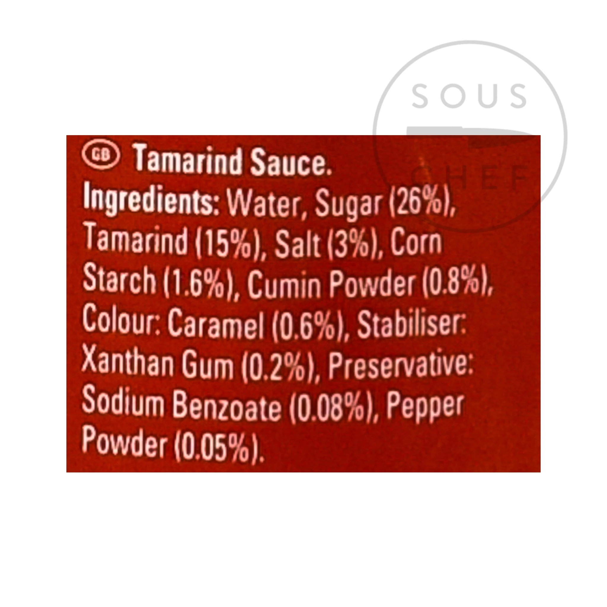 Ingredienti: Acqua, estratto di tamarindo (15%), zucchero, sale, gomma di xantano stabilizzante, cumino, benzoato di sodio conservante, colore: caramello, aroma naturale, pepe.