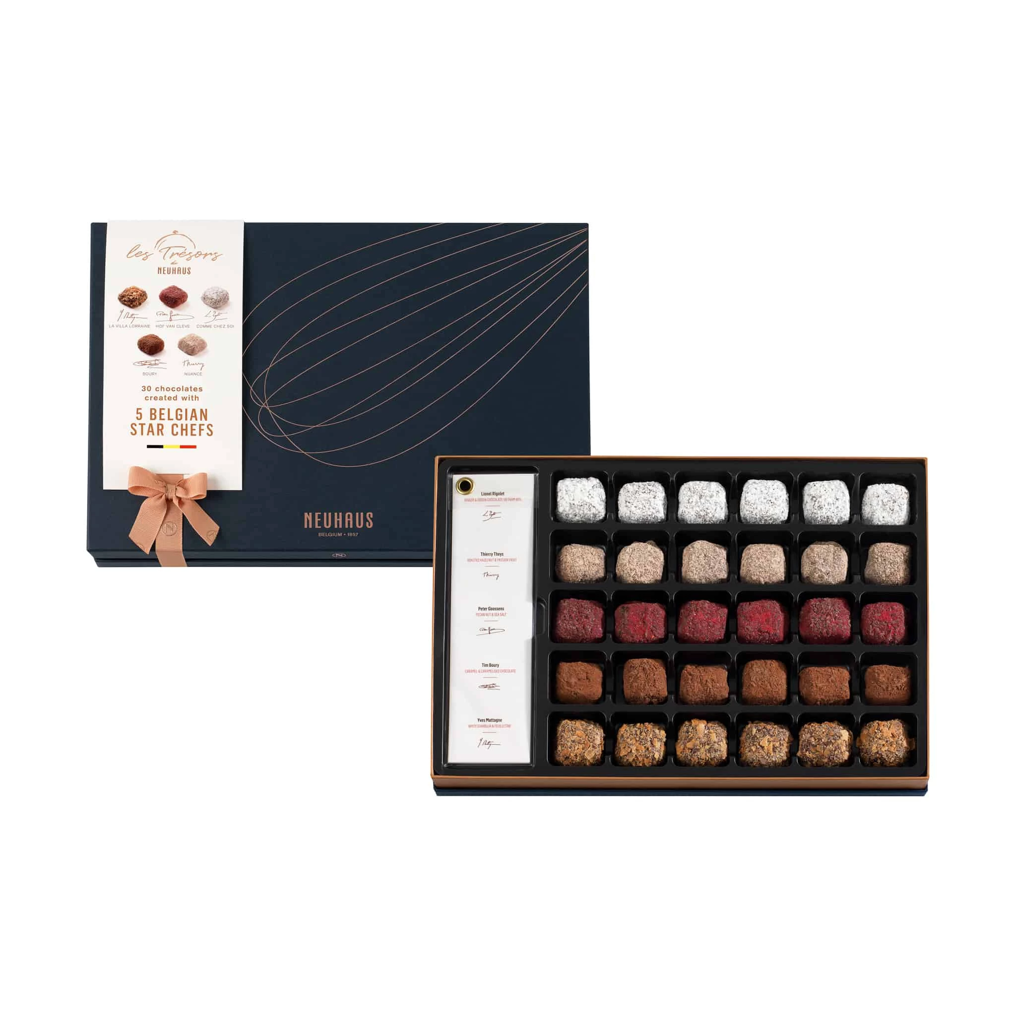Neuhaus “Les Trésor de Neuhaus” pralines presenta 30 cioccolatini creati in collaborazione con rinomati chef belgi stellati Michelin – aregalo di lusso per gli amanti del cioccolato. La selezione di cioccolato comprende cinque sapori unici – lampone, pecan & sale marino, nocciola Piemonte, cioccolato bianco e zenzero, nocciola tostata e frutta della passione e aceto di caramello.