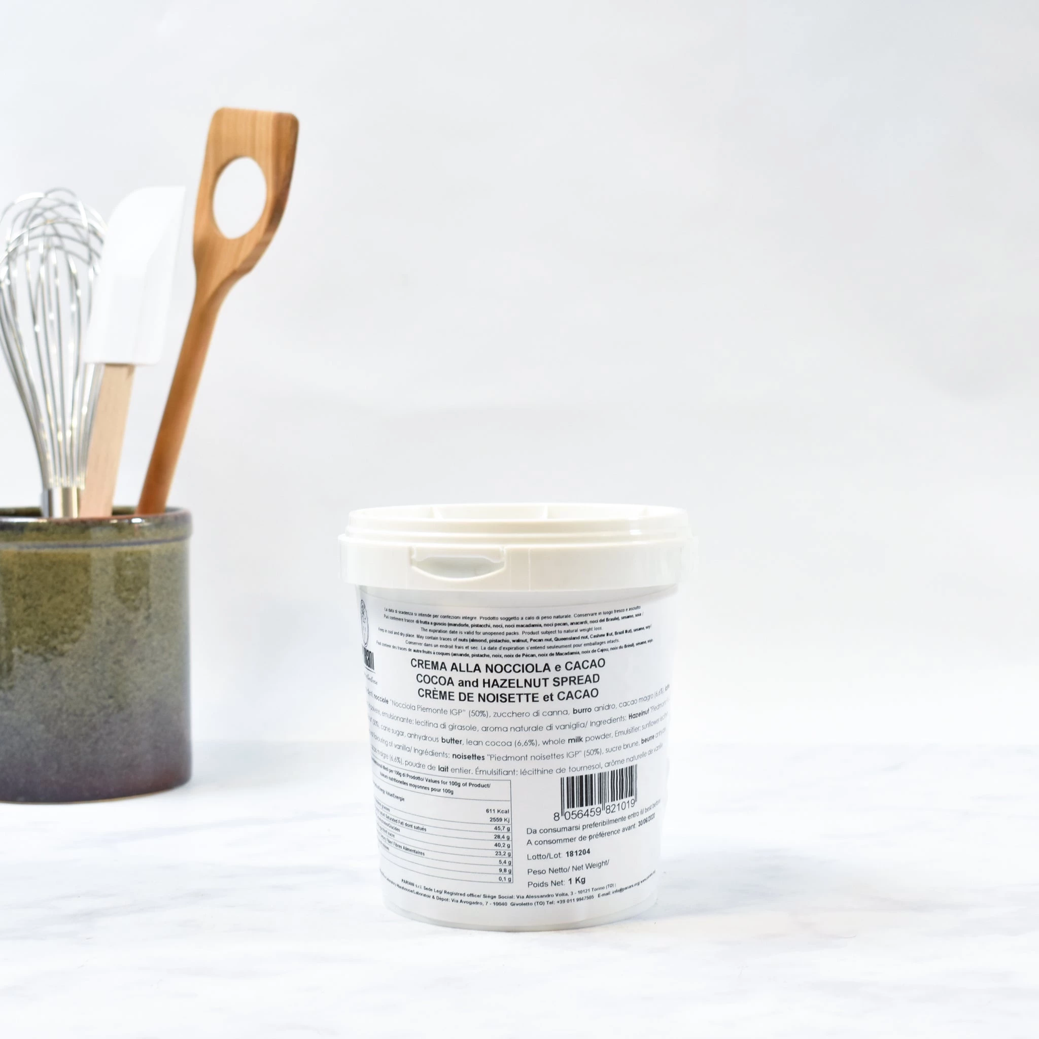 Gianduja è la parola italiana per una miscela di cioccolato e nocciole. È stata inventata a Torino durante il regno di Napoleone. Il nome deriva da Gianduja, un personaggio tradizionale carnevale e marionette che rappresenta i nativi del Piemonte doveLa pasticceria a base di nocciole è popolare. Tradizionalmente è al 30% di nocciola, ma questa lussuosa spalmatura è una nocciola piemontese al 50%!