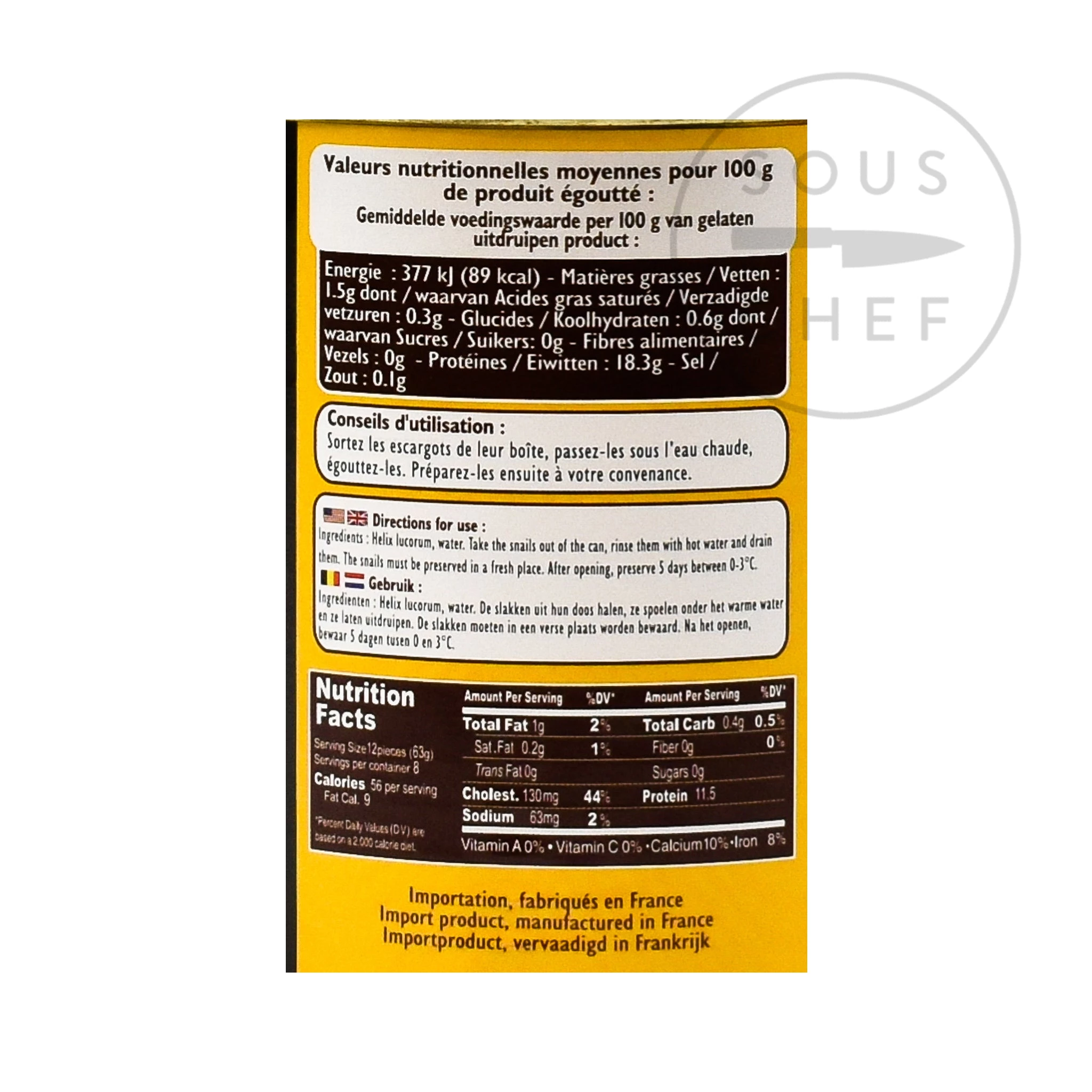 Le lumache sono considerate una specie di prelibatezza francese, spesso chiamata “lumache di lumaca,” e spesso cotte con burro, scalogno finemente tagliato, aglio, prezzemolo, sale e pepe. Questa latta extra grande di lumache francesi è ideale per una cenao per il catering.