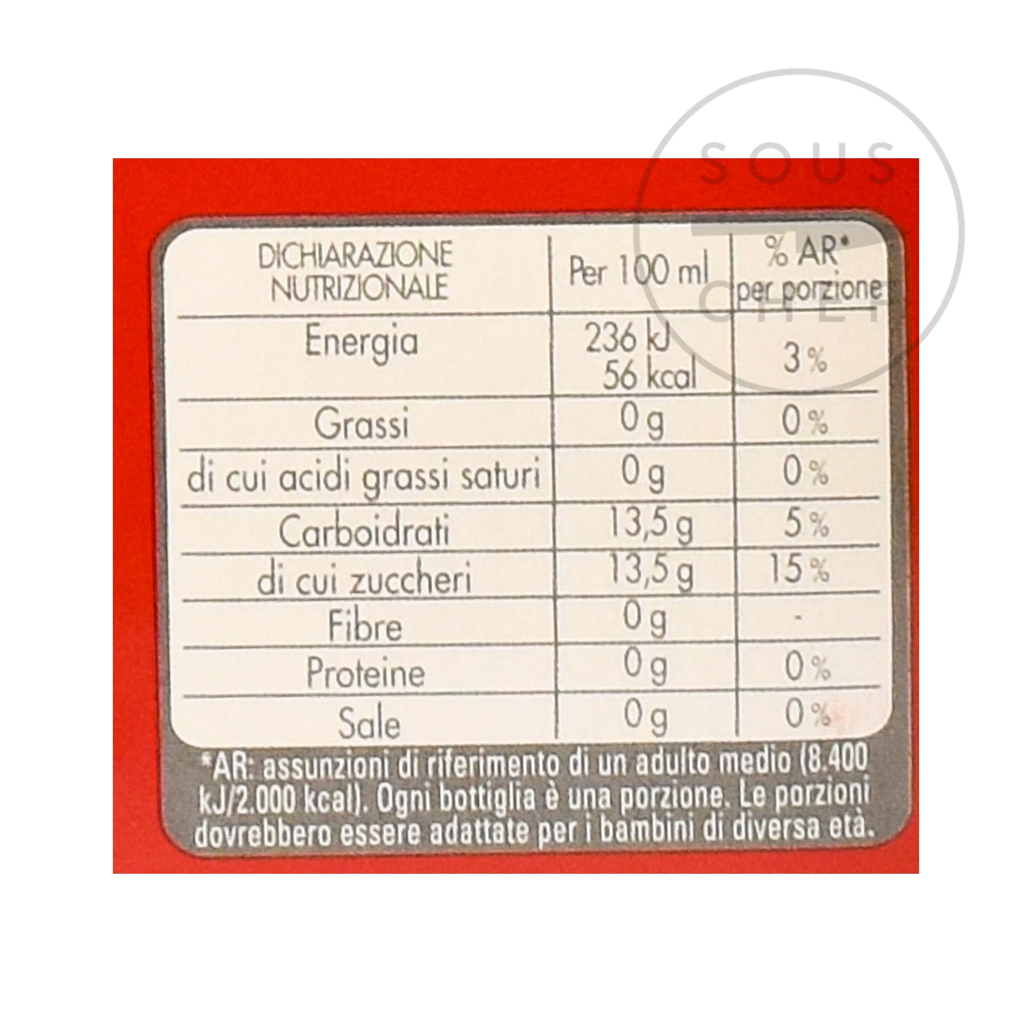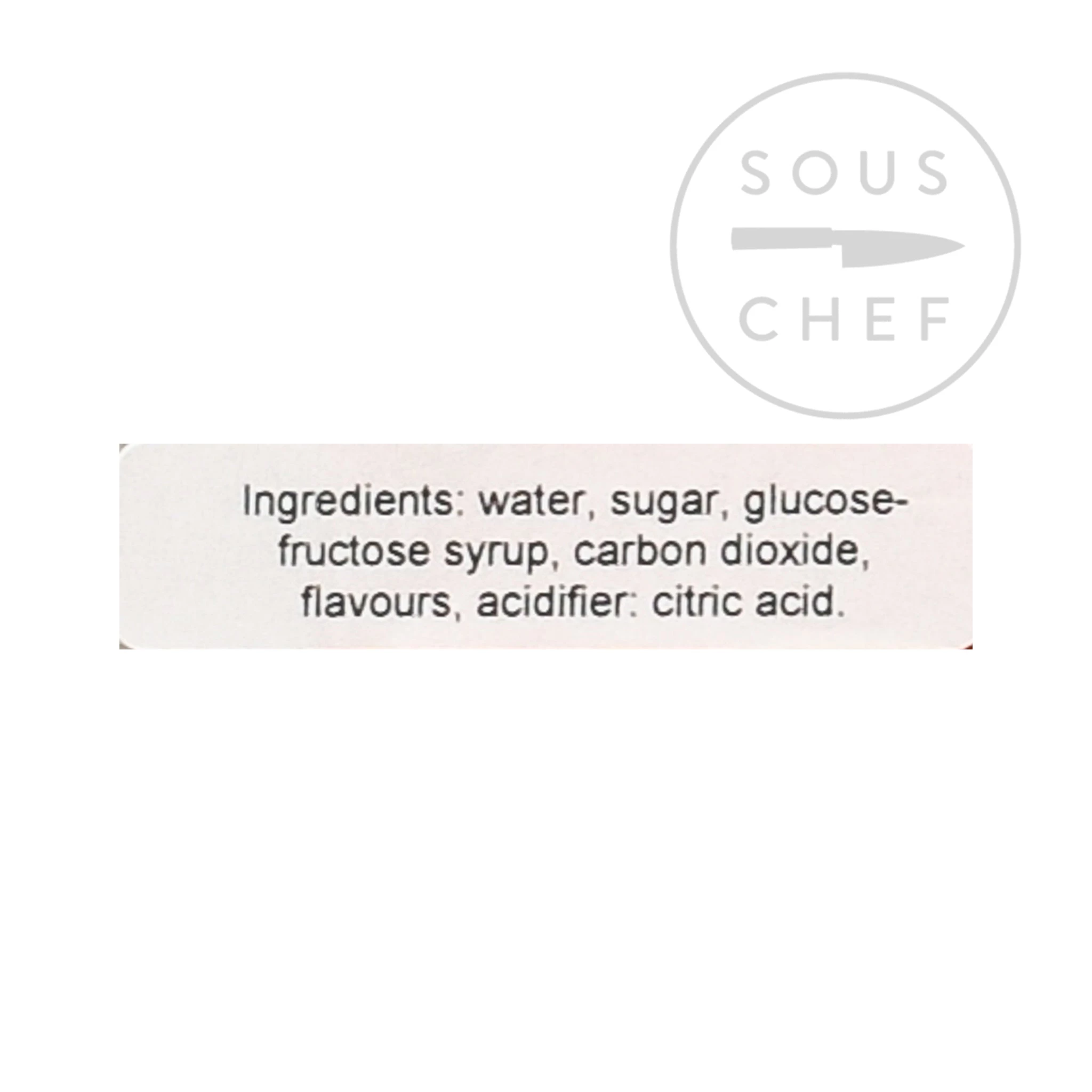 Ingredienti: acqua, zucchero, sciroppo di glucosio-fruttosio, anidride carbonica, aromi, acidificante: acido citrico.