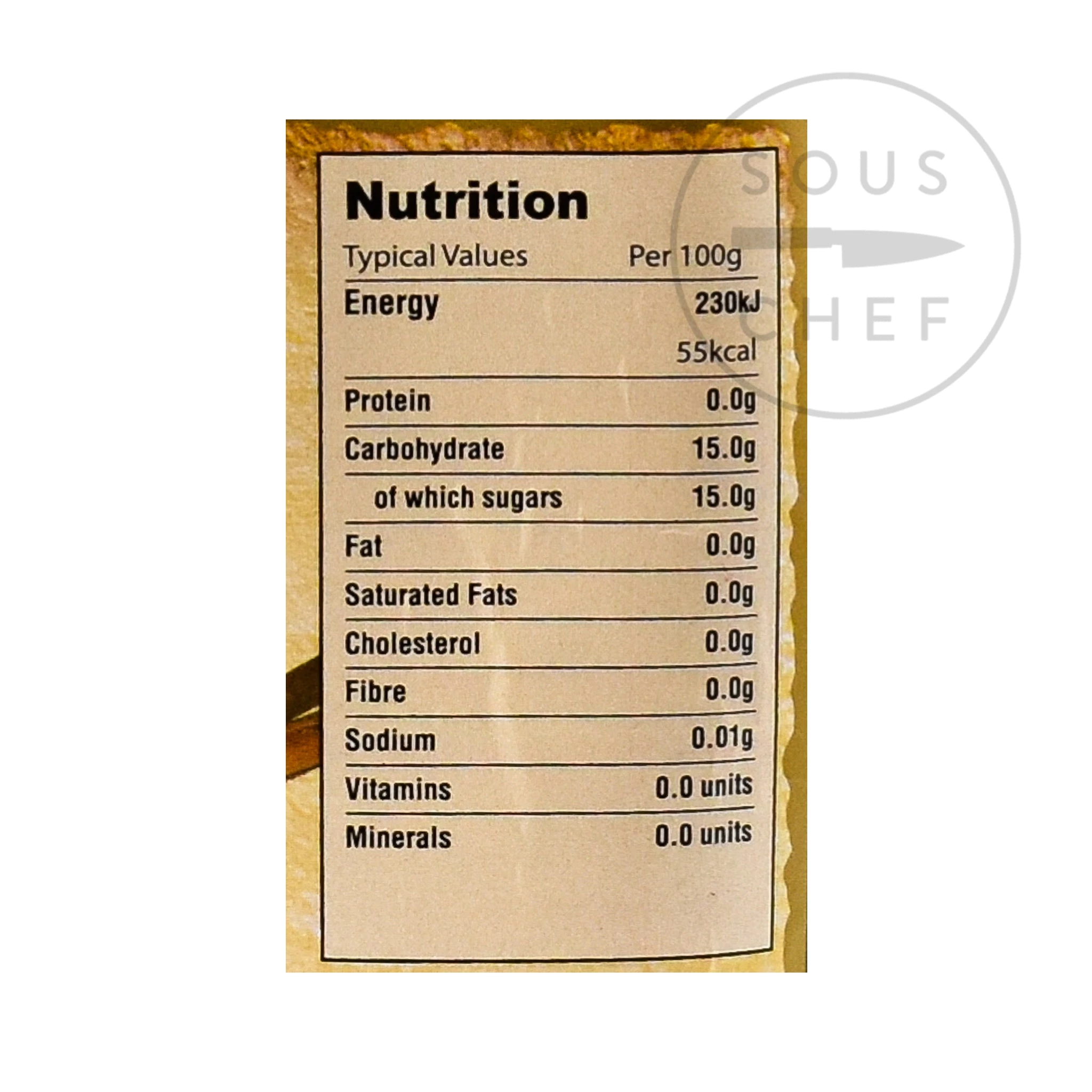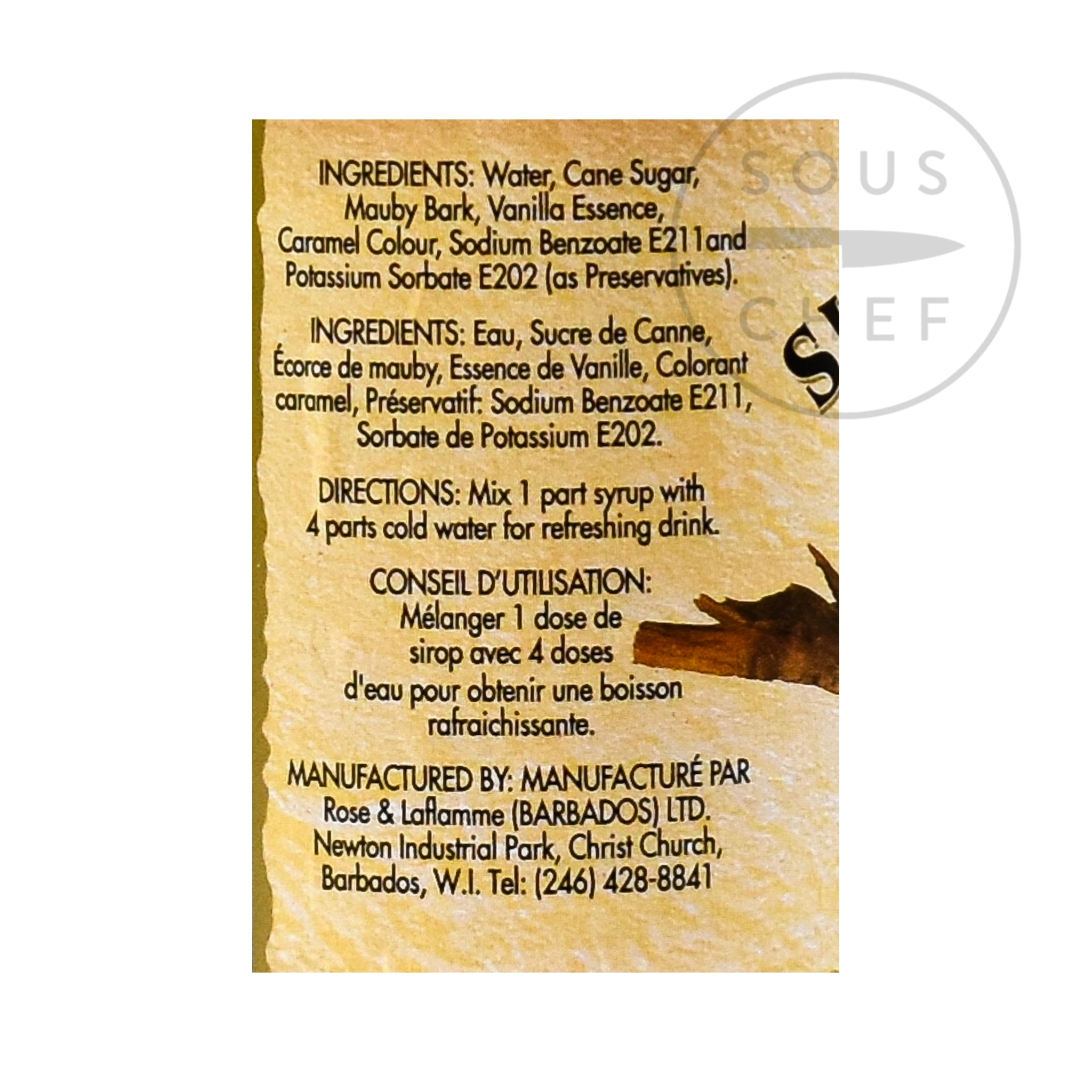 Ingredienti: Acqua, zucchero di canna, corteccia di mauby, essenza di vaniglia, colore caramello, benzoato di sodio E211 e sorbato di potassio E202 (conservanti).