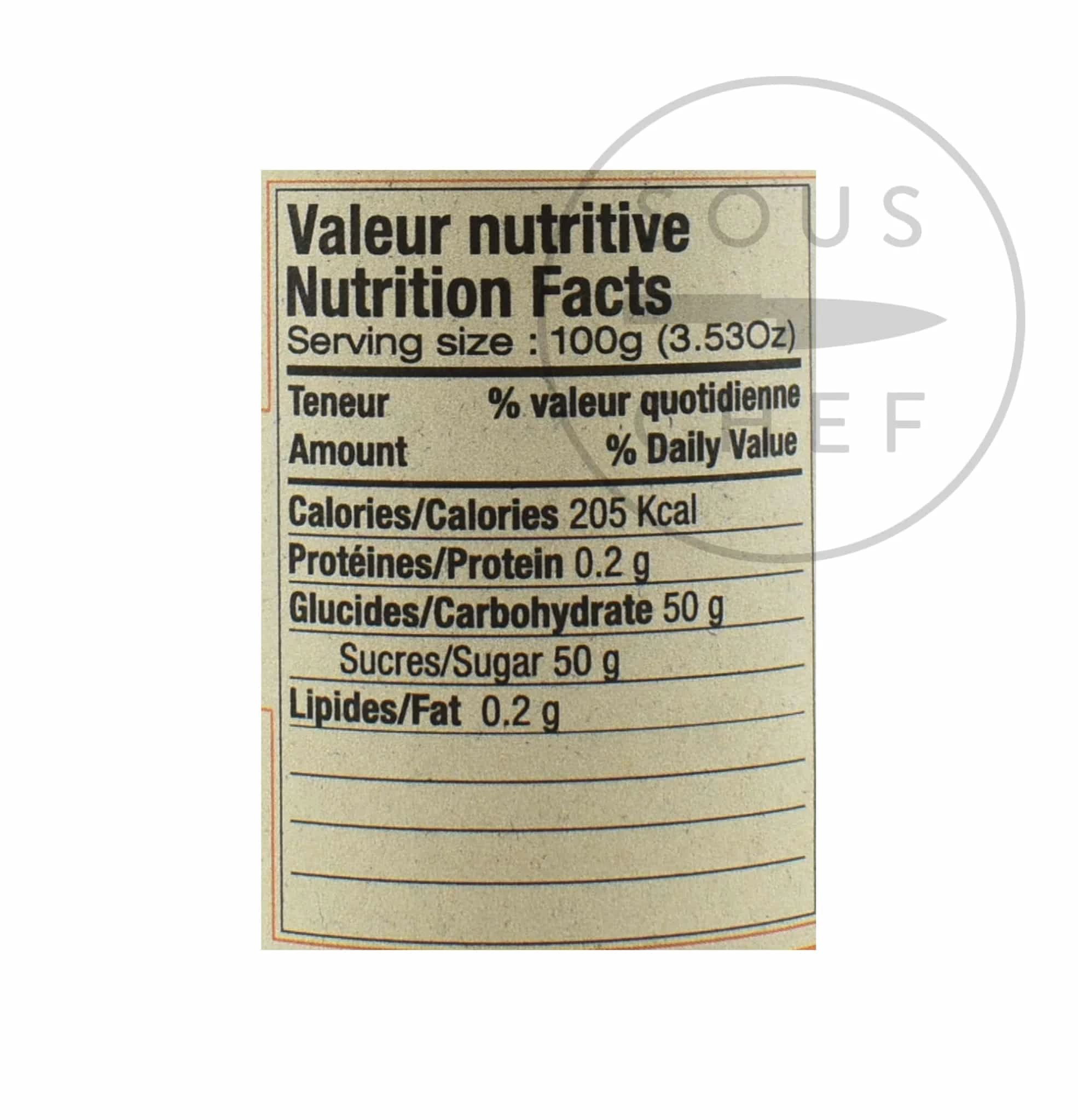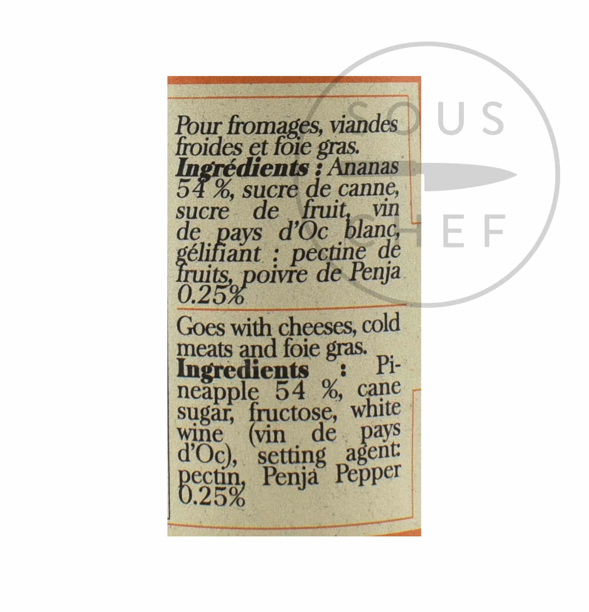 Ingredienti: ananas 54%, zucchero di canna, zucchero di frutta, vino bianco Oc, gelling: frutta pectina, pepe Penja 0,25%.