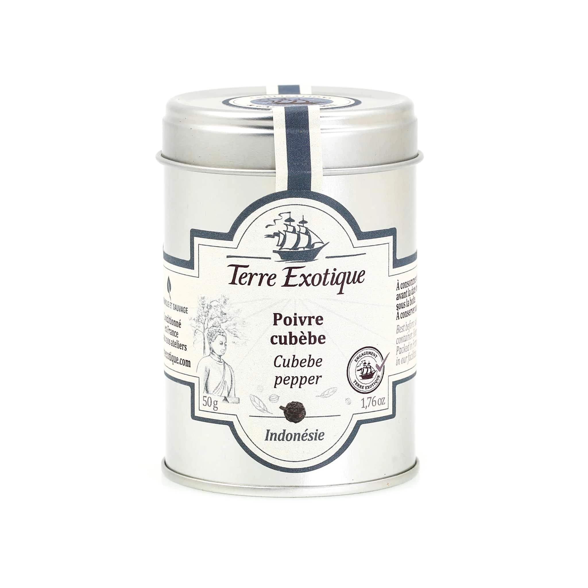 Terre Exotique Cubeb pepe aggiunge una piccantezza fredda a piatti di carne più ricchi. Originari dell’India sud-occidentale, questi piccoli peperoni (anche knproprio come pepe coda, grazie ai piccoli steli attaccati ad ogni bacca) sono raccolti in Indonesia e sono noti per le loro note amare, aromatiche di chiodi di garofano ed eucalipto.