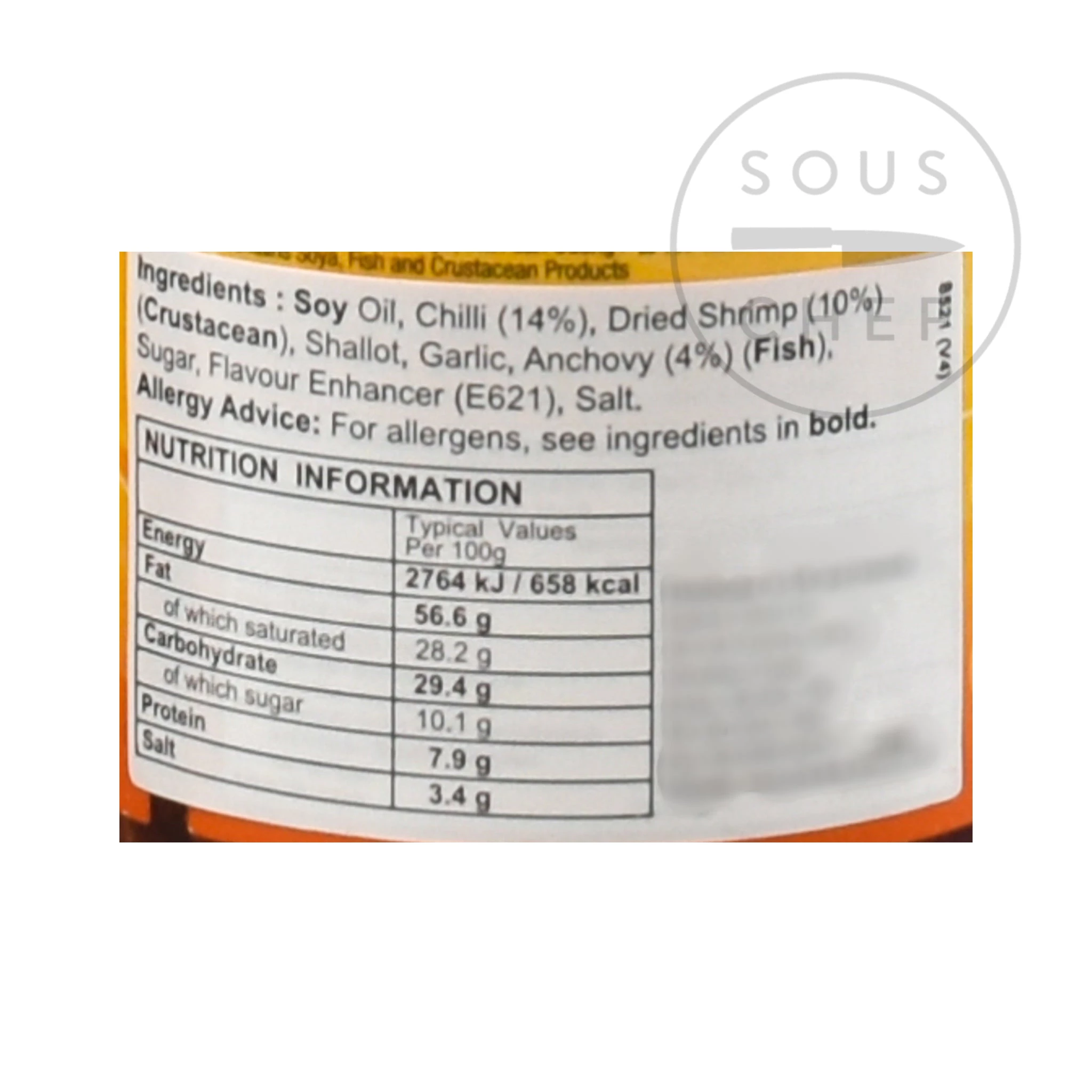 Ingredienti: olio di soia, peperoncino (14%), gamberetti (10%), scalogno, aglio, acciuga (4%), zucchero, esaltatore di sapidità (E621), sale. Contiene allergeni: soia, crostacei, pesce.