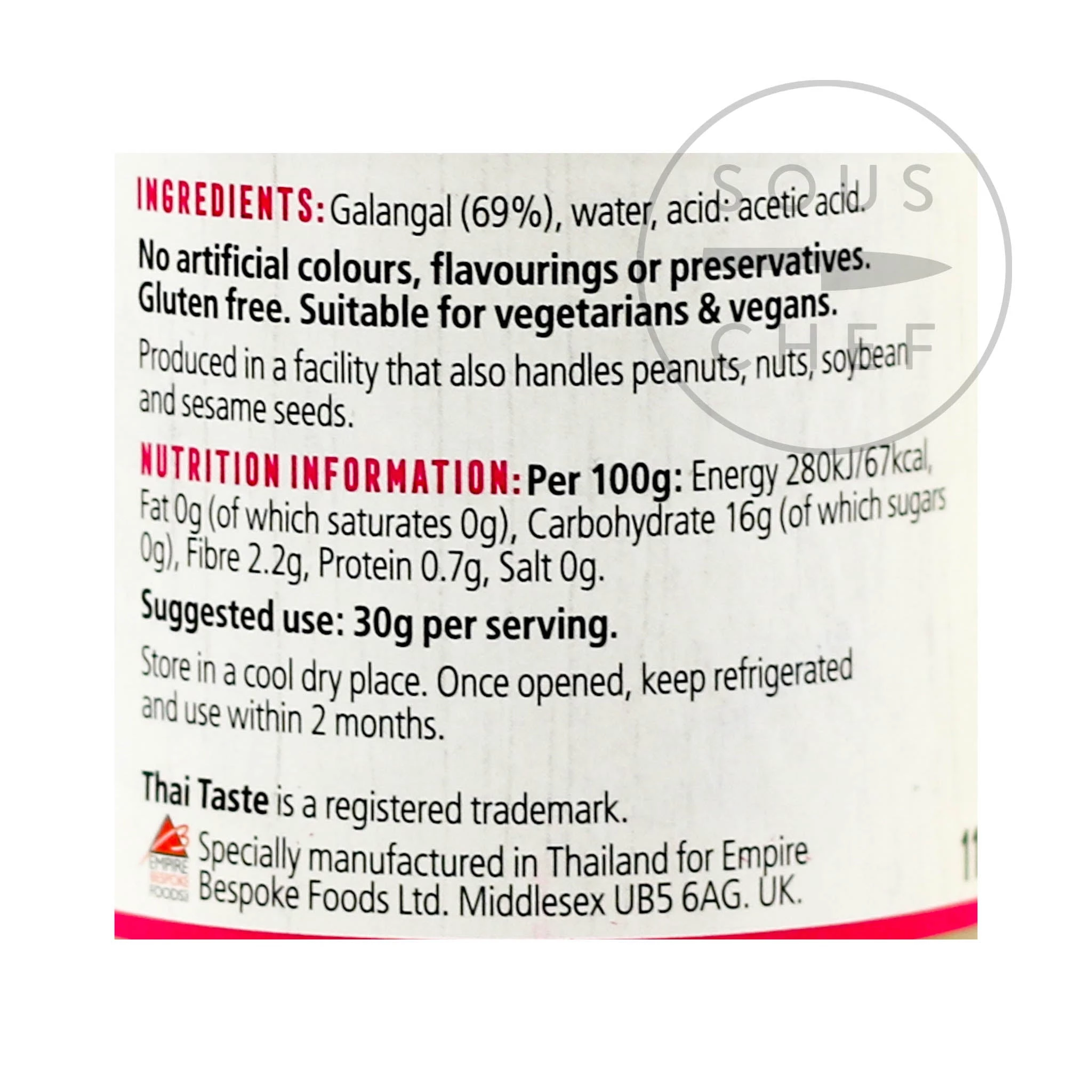 Ingredienti: galangal (69%), acqua, acido acetico. Prodotto in una struttura che gestisce anche le arachidis, noci, soia e semi di sesamo.