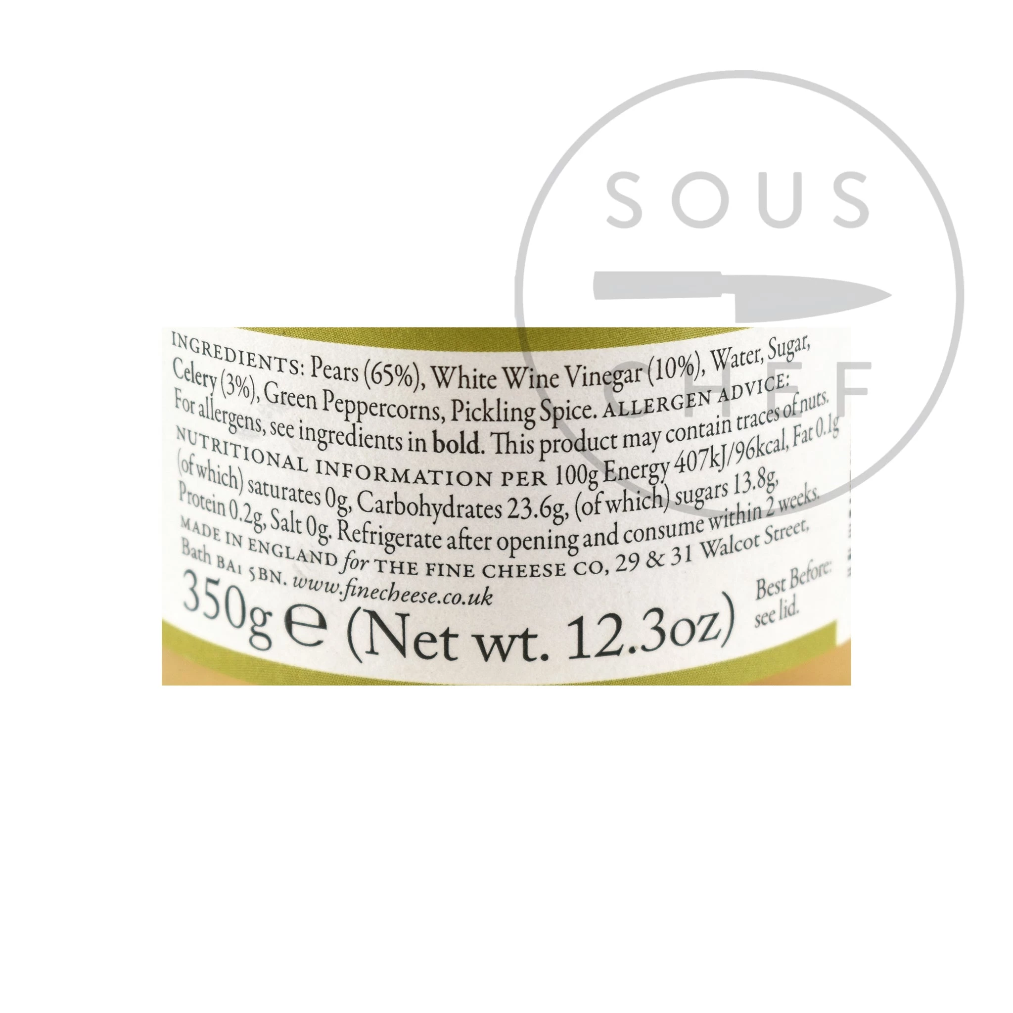Ingredienti: Pere (65%), aceto di vino bianco (10%), acqua, zucchero, celery (3%), pepe verde, spezia decapata.