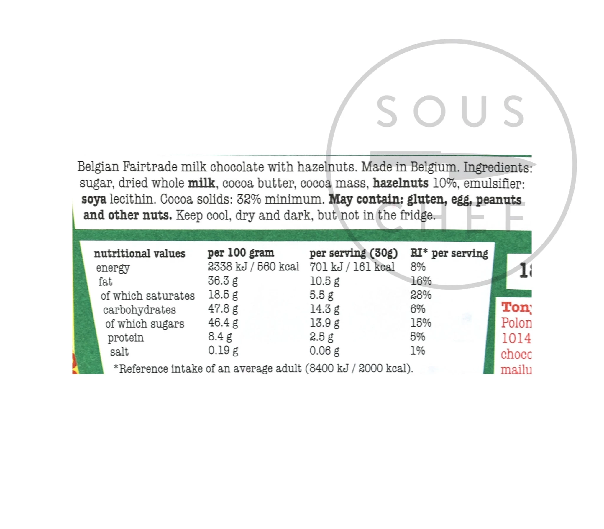 Ingredienti: Zucchero, intero secco milk, burro di cacao, coccoa massa, hazelnuts 10%, emulsionante: soya lecithin.