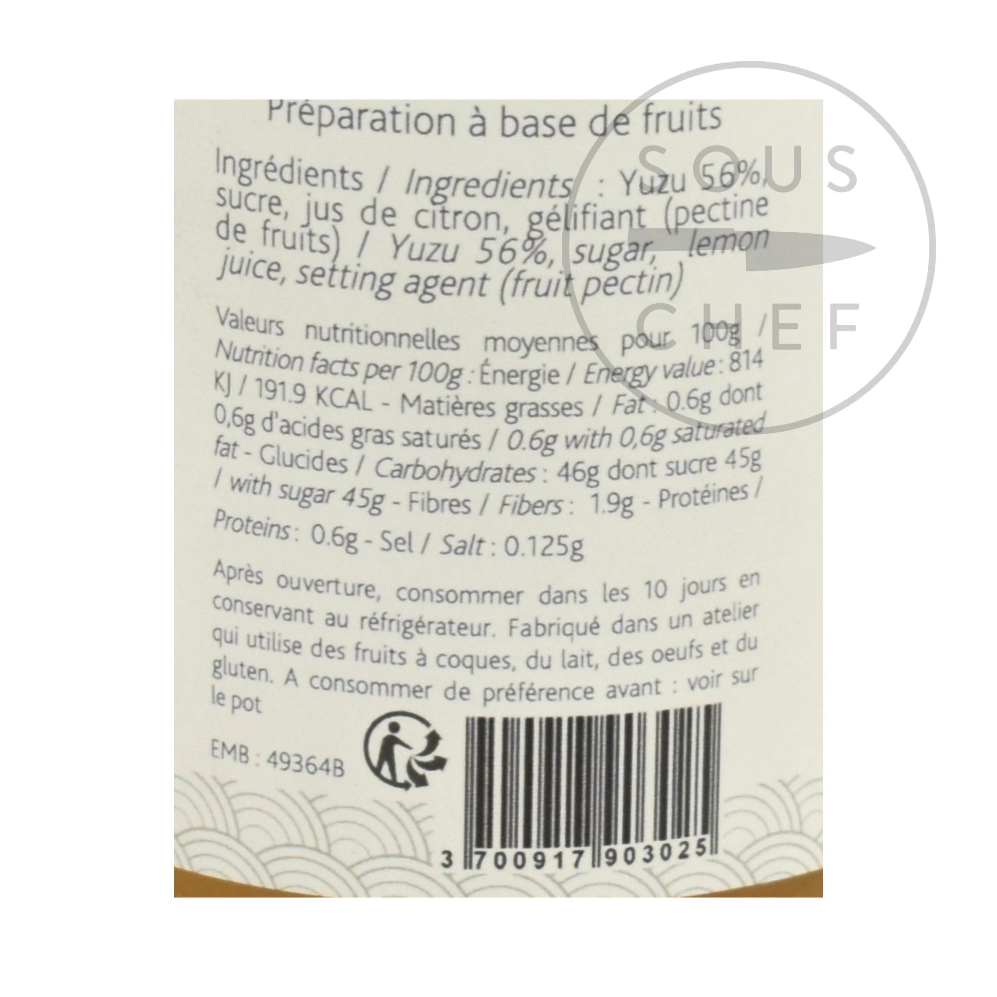 Ingredienti: Yuzu (56%), zucchero, succo di limone, agente di regolazione (pectin)