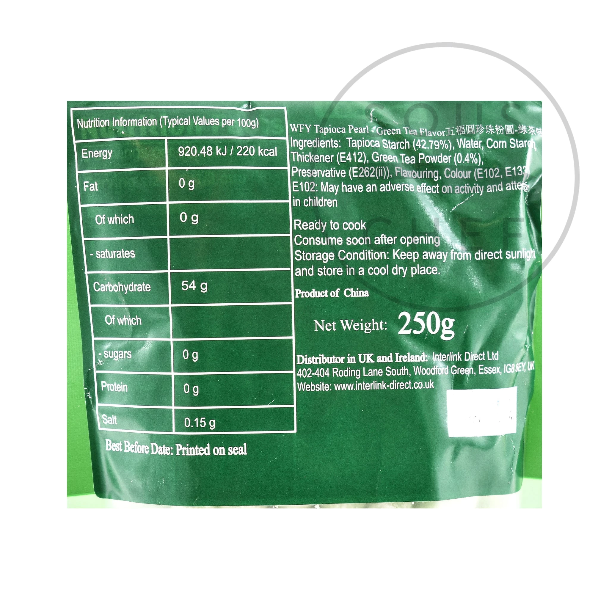 Ingredienti: amido di tapioca (42.79%), acqua, amido di mais, addensante (E412), polvere di tè verde (0,4%), conservante (E262 (ii)), aroma, colore (E102, E133). E102: può avere un effetto negativot sull’attività e l’attenzione nei bambini.
