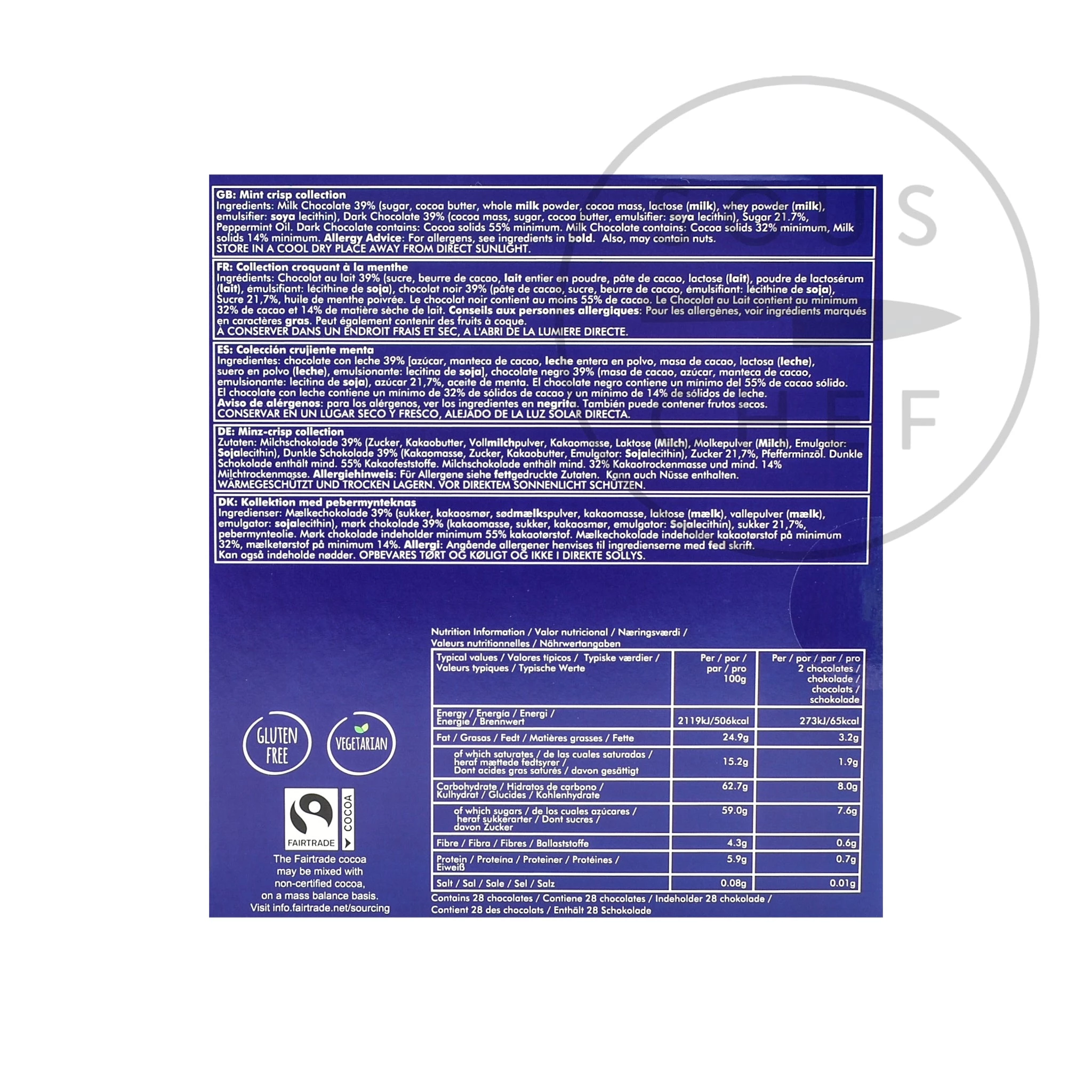 Ingredienti: Cioccolato al latte 39% (zucchero, burro di cacao, intero milk powder, cacao mass, lattosio (milk), siero di latte in polvere (milk), emulsionante: soya lecitina), cioccolato scuro 39% (cococoa mass, zucchero, burro di cacao, emulsionante: soya lecitina), zucchero, olio di menta piperita.
