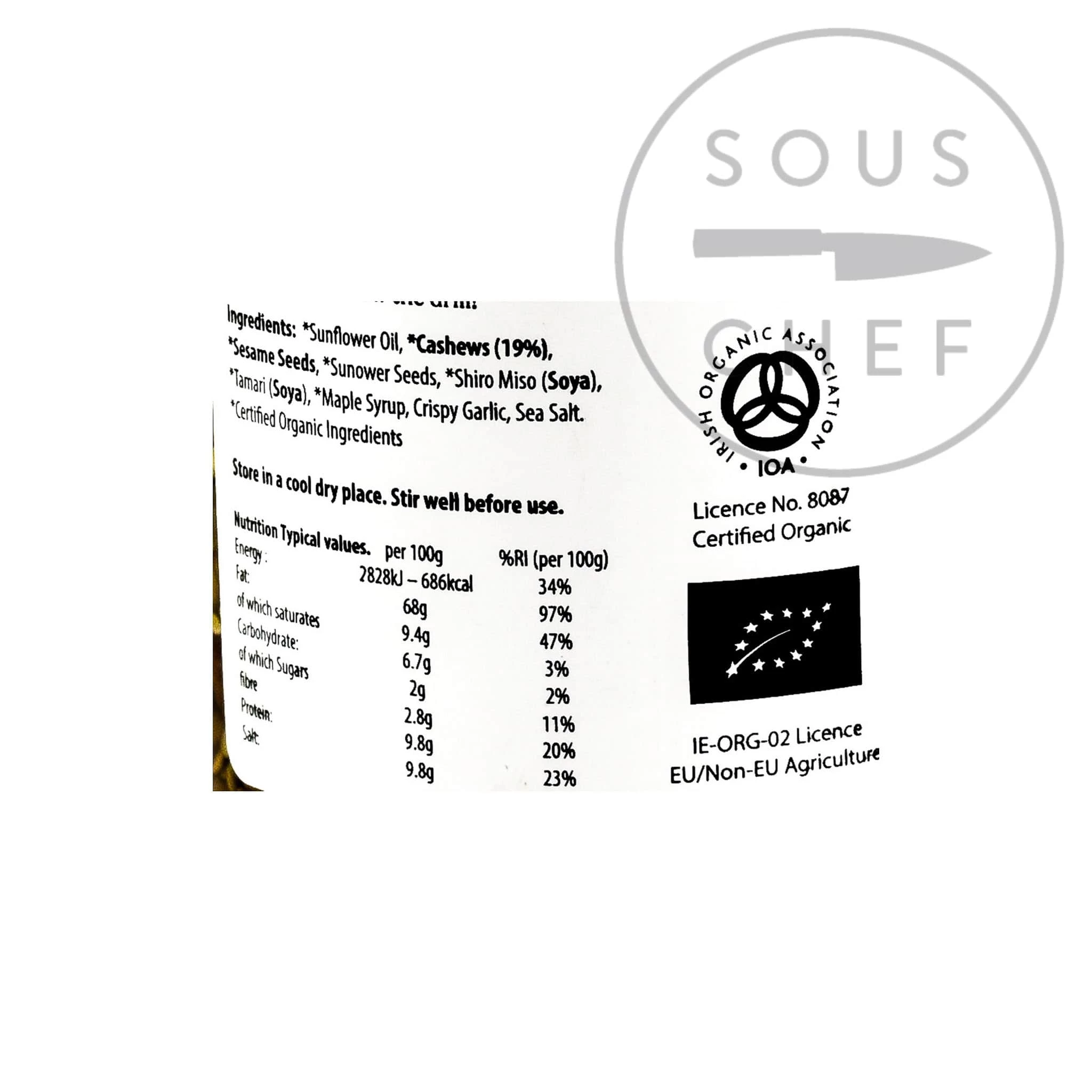 Ingredienti: *Sunflower oil, *cashews (19%), *sesame seeds, *sunflower seeds, *shiro miso (soya), *tamari (soya), *maple sciroppo, aglio croccante, sale marino. * Certified Organic