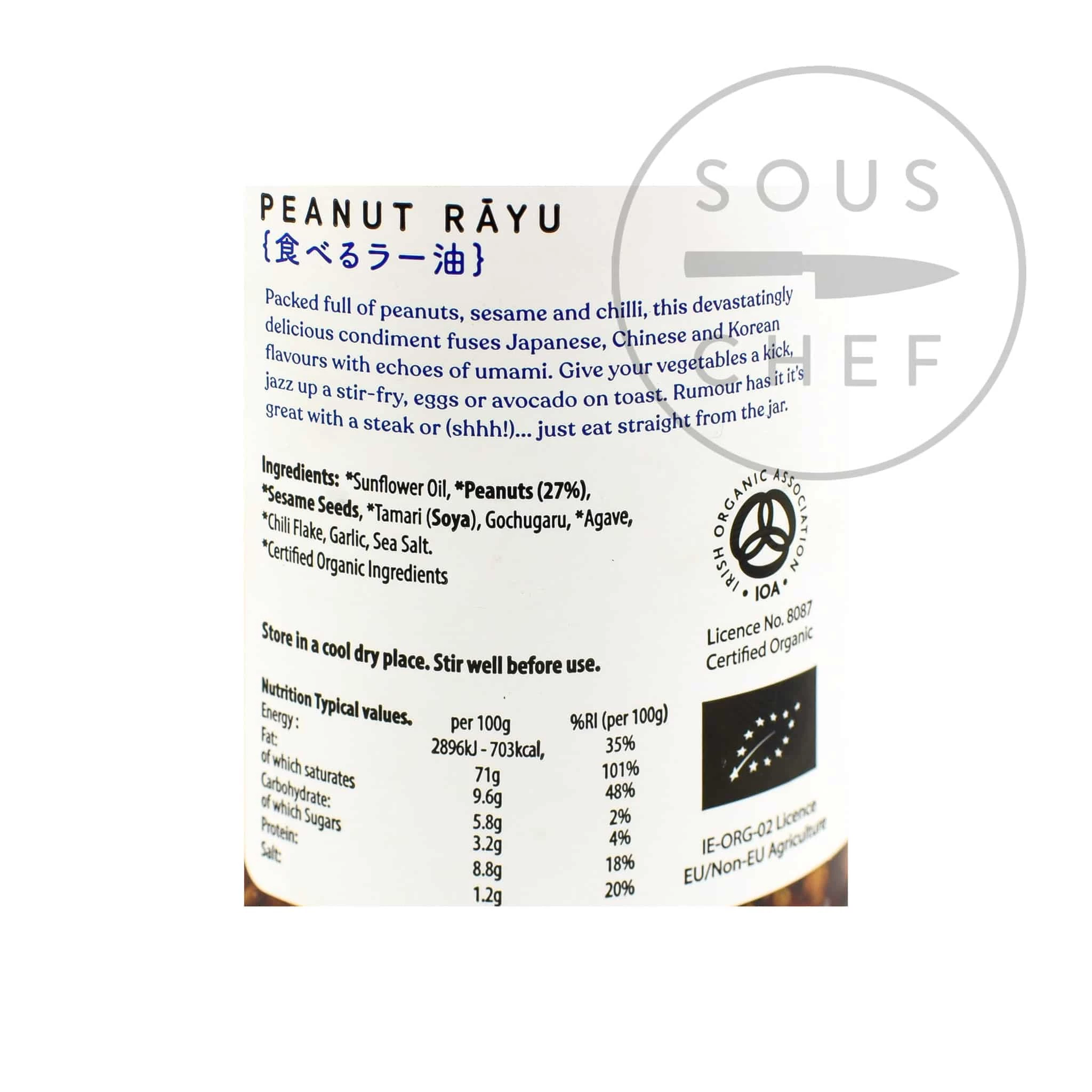 Ingredienti: *Olio di sunflower, *peanuts (27%), *sesame seeds, *tamari (soya), gochugaru, *agave, *chilli flake, aglio, sale marino. *Ingredienti organici certificati.