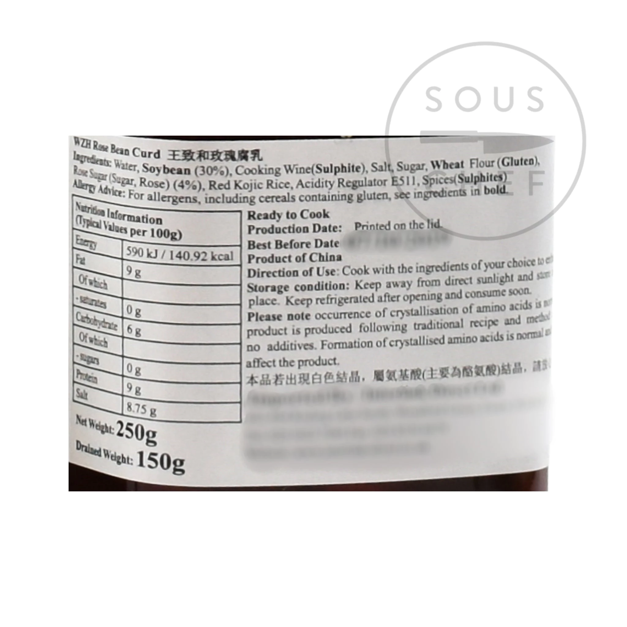 Ingredienti: acqua, soybean (30%), vino da cucina, sale, zucchero, grano (gluten) farina, rosa addolcita (zucchero, rosa) (4%), lievito rosso, regolatore di acidità E511, spezie ( solfitos ).