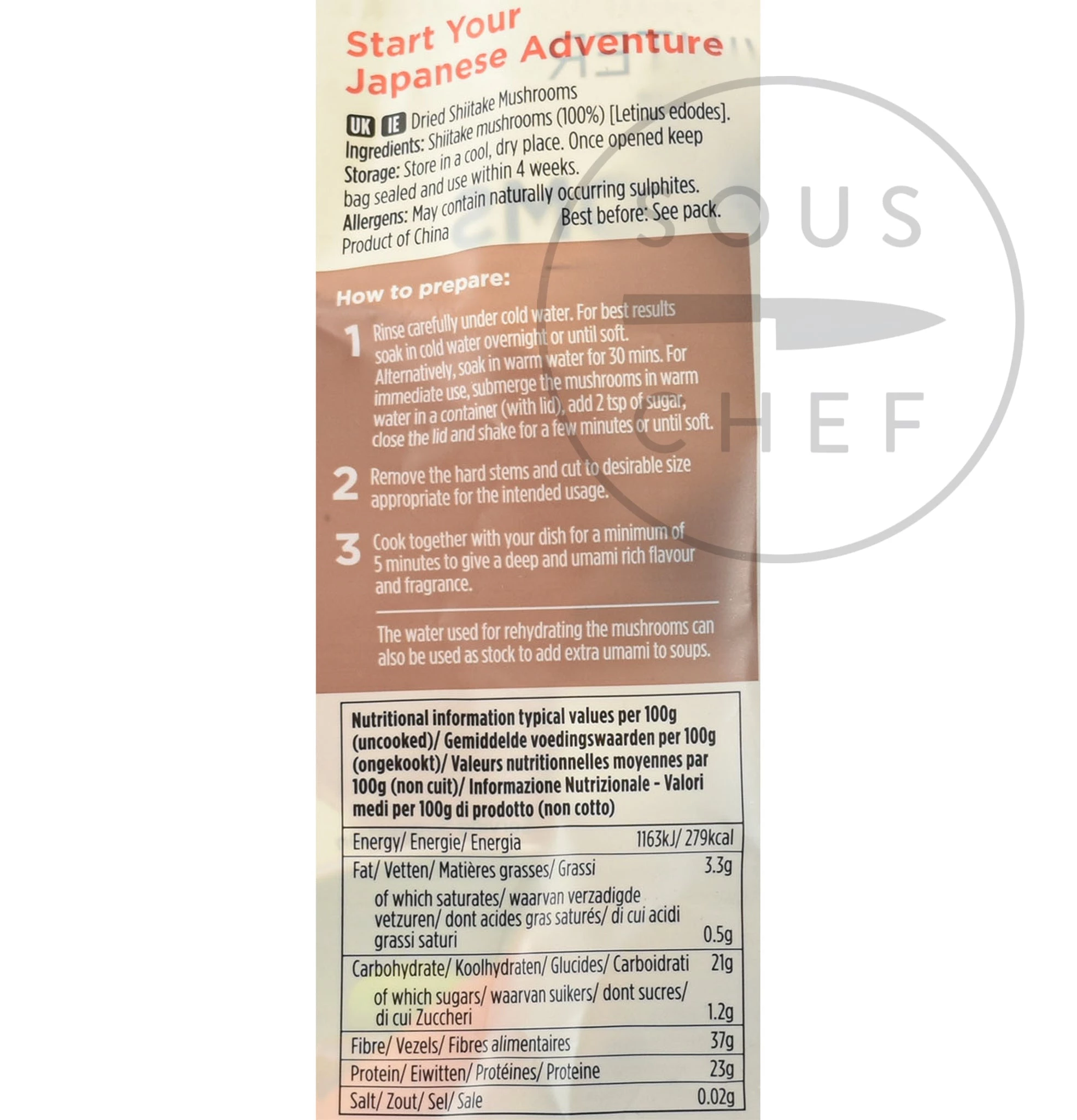 Ingredienti: funghi sciitake secchi (100%) (Letinus edodes). Può contenere sulfit naturalees.